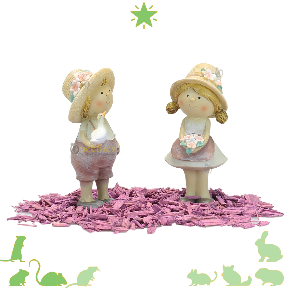 Breng een speelse en vrolijke sfeer naar je hamsterscape met deze schattige kunsthars figuren van boerderij kinderen. Perfect voor een lente of zomerthema voegen deze figuren een charmant en kleurrijk element toe aan het Hamster Terrarium. De figuren zijn in zachte roze tinten en staan op de foto op een bed van kleurrijke Color Wood.