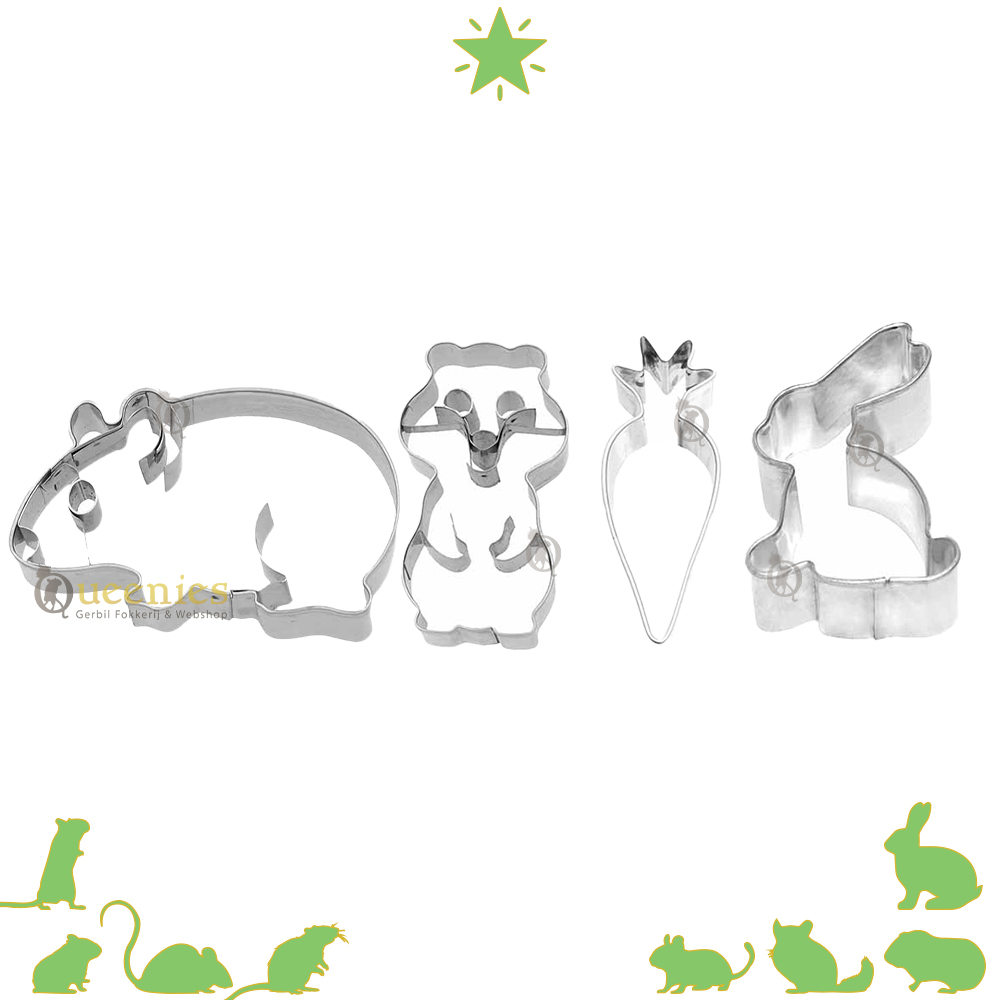 Inhoud: Verpakt per 1 stuk Afmeting Hamster Koekjes vorm: 2,5 x 4 x 7 cm ( L x D x H ) Afmeting Konijn Koekjes vorm: 5,5 x 4,2 x 2,6 cm ( L x D x H ) Afmeting Cavia Koekjes vorm: 2,5 x 7 x 4 cm ( L x D x H ) Afmeting Wortel Koekjes vorm: 7 x 3 x 2 cm ( L x D x H ) Materiaal: Roestvrijstaal Geschikt voor: Dierenliefhebbers