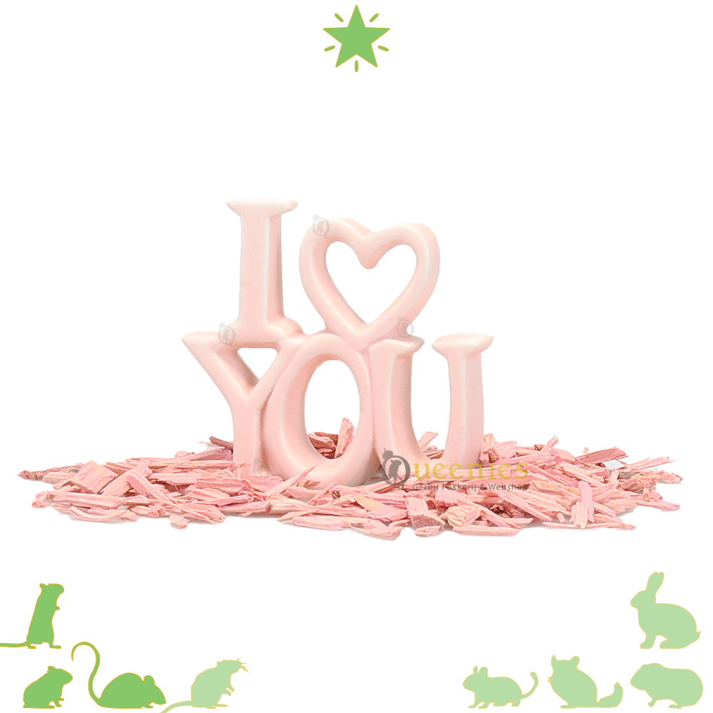 Op de hoofdfoto hebben wij dit liefdevolle ornament gezet op een bedje van Color Wood in de kleur licht roze. Dit matcht erg mooi met elkaar en geeft zo een nog romantischere uitstraling aan het ornament voor knaagdieren. Het is een veelzijdig stuk dat niet alleen visueel aantrekkelijk is, maar ook een liefdevolle boodschap uitstraalt. Voeg dit "I Love You" ornament toe aan je terrarium om een warme en uitnodigende sfeer te creëren die de band tussen jou en je huisdier onderstreept.
