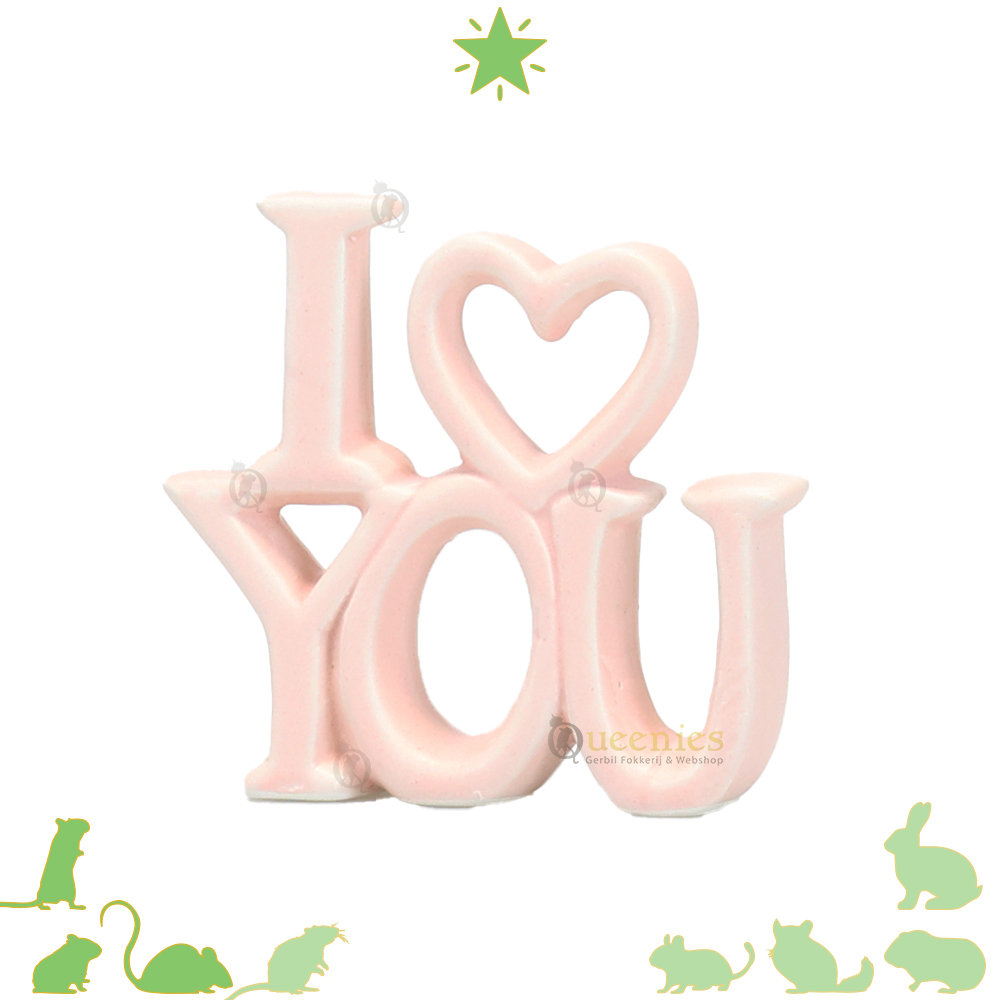 Breng een vleugje liefde en elegantie naar je Terrarium / Gerbilarium met deze liefdevolle "I Love You" ornament van kunsthars. Dit charmante en stijlvolle decoratiestuk, uitgevoerd in zacht roze, is erg leuk om boven op je Terrarium / Gerbilarium te plaatsen, maar kan ook veilig in het terrarium gebruikt worden. De gaten in het ornament zijn veilig voor Muizen, Dwerghamsters en jonge Gerbils, waardoor deze knaagdieren niet vast kunnen komen te zitten. Om die reden is het ook een geschikt decoratie artikel voor in de Hamsterscaping.