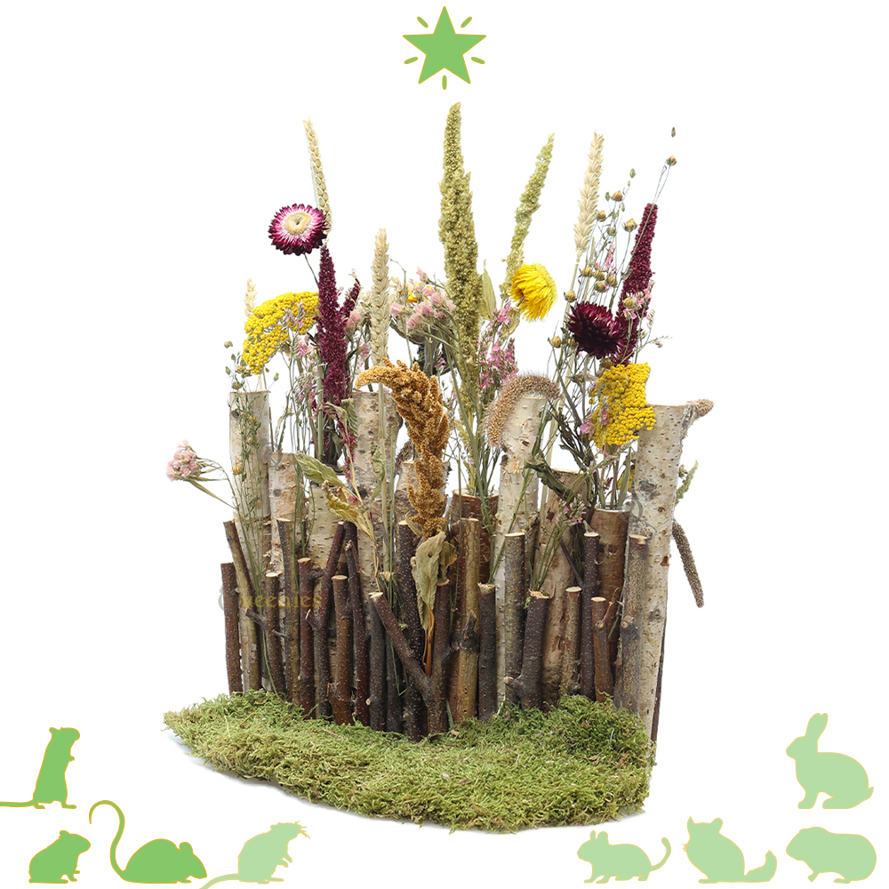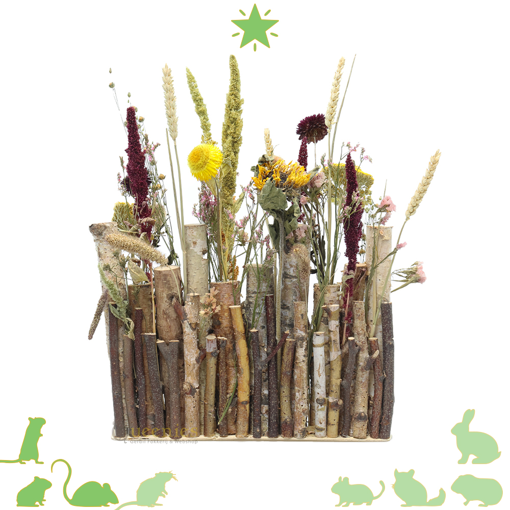 Een oogsthouder is een decoratieve en functionele structuur die vaak bestaat uit natuurlijke materialen zoals hout, bamboe, mos en gedroogde bloemen en of granen. Onze oogsthouder is ontworpen om een natuurlijke afscheiding te creëren binnen een hamsterscape plus dat je deze direct mooi kunt gebruiken als oogsthouder! Het biedt zowel een visuele aantrekkingskracht als een praktische functie door verschillende gebieden in de kooi af te scheiden en een natuurlijke habitat na te bootsen.