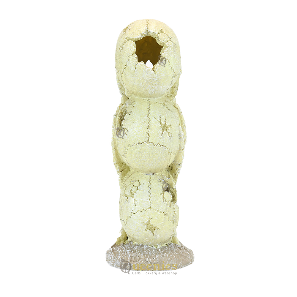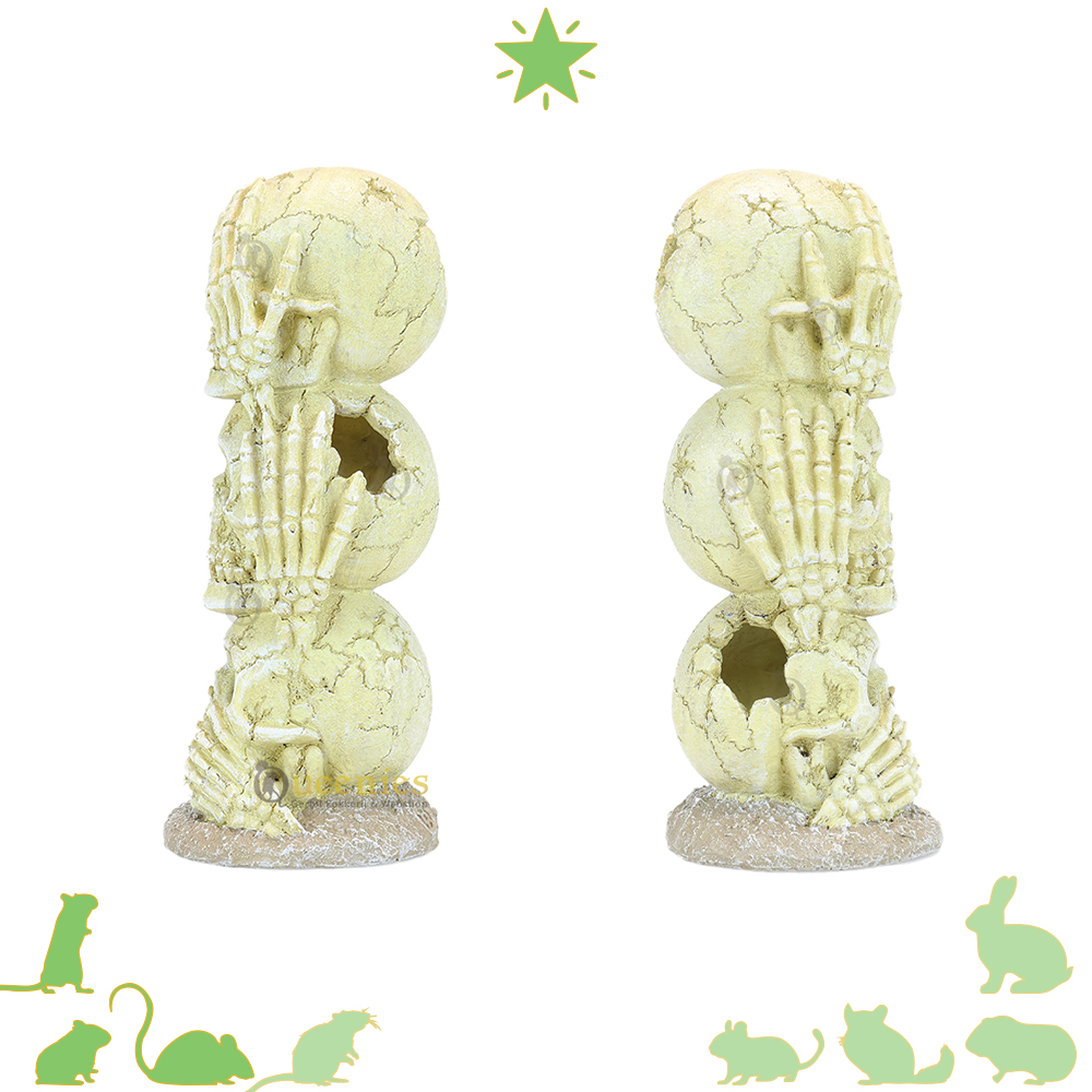 De totempaal bestaat uit drie zorgvuldig gestapelde schedels. Elk van de schedels heeft gedetailleerde kenmerken, handen over de ogen, handen over de oren en handen over de mond wat een speels en geheimzinnig effect creëert. Het gebruik van kunststof zorgt ervoor dat de Totempaal duurzaam en veilig is voor Knaagdieren. Het materiaal is niet-toxisch en bestand tegen knagen waardoor het veilig in het Terrarium kan worden neergezet.