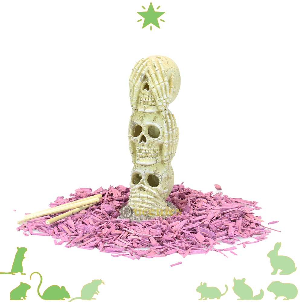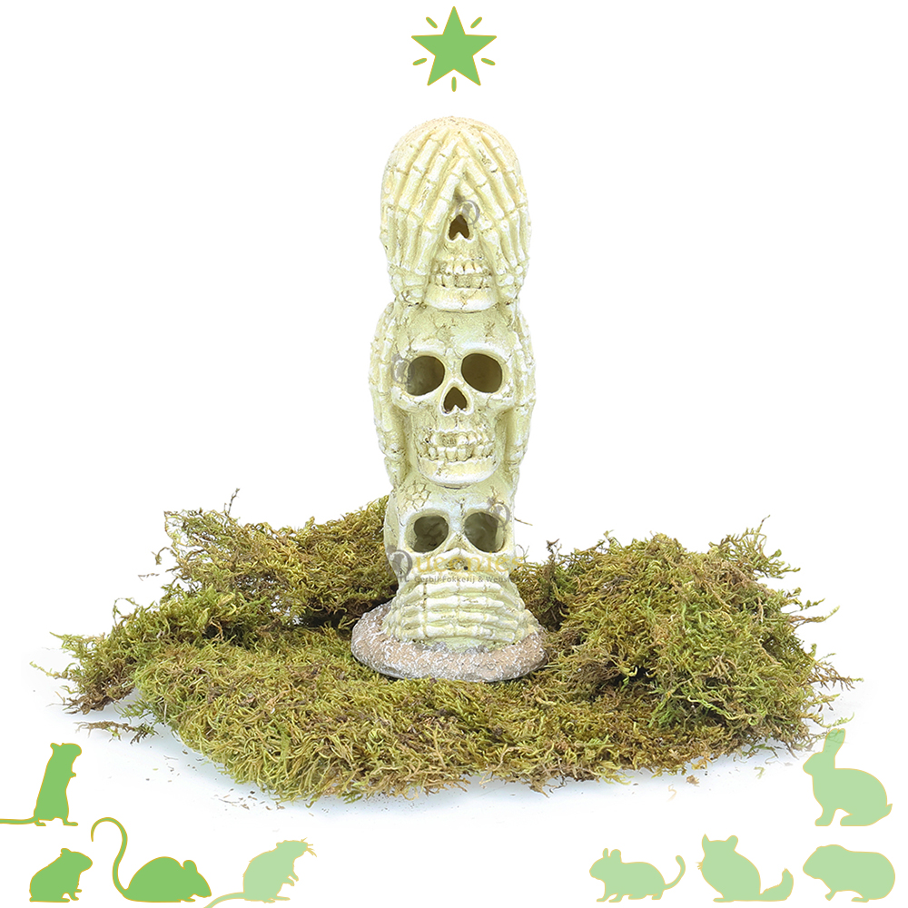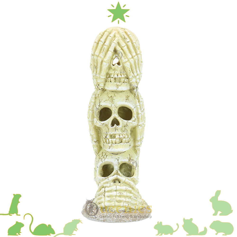 De Schedel Totempaal is onze nieuwe Avontuurlijk toevoeging voor een griezelige Halloween inrichting. De horen, zien en zwijgen totempaal is een indrukwekkend decoratiestuk die in elke Knaagdier Terrarium past. De Schedel Totempaal is gemaakt van Kunshars dat bestand is tegen het knagen van Knaagdieren. Hierdoor gaat de Schedel Totempaal lang mee, de Totempaal is niet zomaar kapot te krijgen.