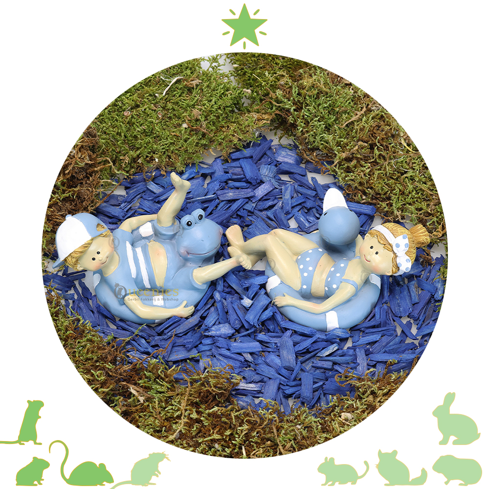 Breng de vrolijke sfeer van het strand naar je Hamsterscape met deze Waterpret 13 cm, decoratieve figuren voor Hamsterscaping in onze gloednieuwe categorie: Decoratieartikelen. Artikelen die je gebruikt om je Hamsterscaping een extra leuke uitstraling te geven met deco artikelen die je gebruikt voor huis en tuin decoratie. Deze vrolijke figureren betaan uit kindjes, een jongen en een meisje die op een 'opblaasbare' zwemband zitten. Leuk te combineren met donker of lichtblauwe Color Wood. charmante kunsthars figuren van kindjes. Leuk te gebruiken in een Zomer themascape, de kindjes voegen een vrolijk en speels effect toe met de verfrissende lichtblauwe kleuren.