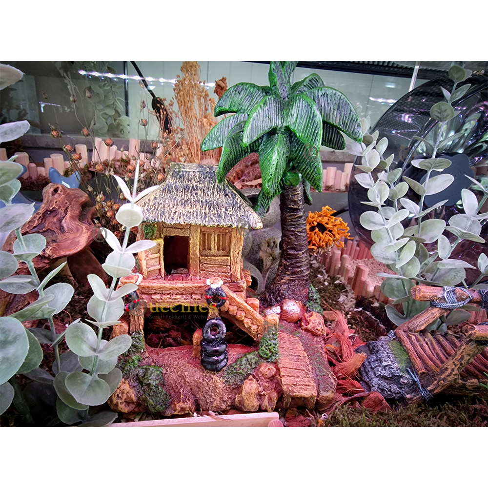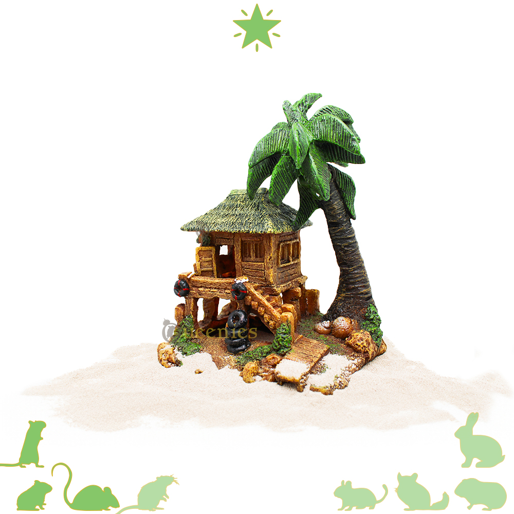 Het Tropical Island huisje is perfect geschikt voor de Beach Hamsterscape theme! Een zomerse Hamsterscaping met een vrolijk karakter en een leuke uitstraling! Wij hebben de Tropical Island gebruikt in de Summer beach Hamsterscape!. Met het warme weer dat eraan zit te komen is het een perfect moment om het thema in een Knaagdieren Terrarium weer te veranderen. Het Tropical island voegt niet alleen een exotische charme toe aan het leefgebied van een Hamster of Gerbil, maar ook kleur. Het product is makkelijk als decoratie te gebruiken. Hamsters kunnen ook onder het huisje doorlopen. Op de foto’s is terug te zien dat er zand onder het Island beach huisje is geplaatst. U kunt dit natuurlijk ook doen met andere materialen. Het Tropical island kan op heel veel manieren worden aangekleed of gebruikt.