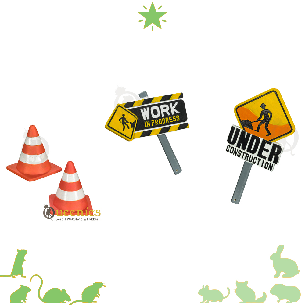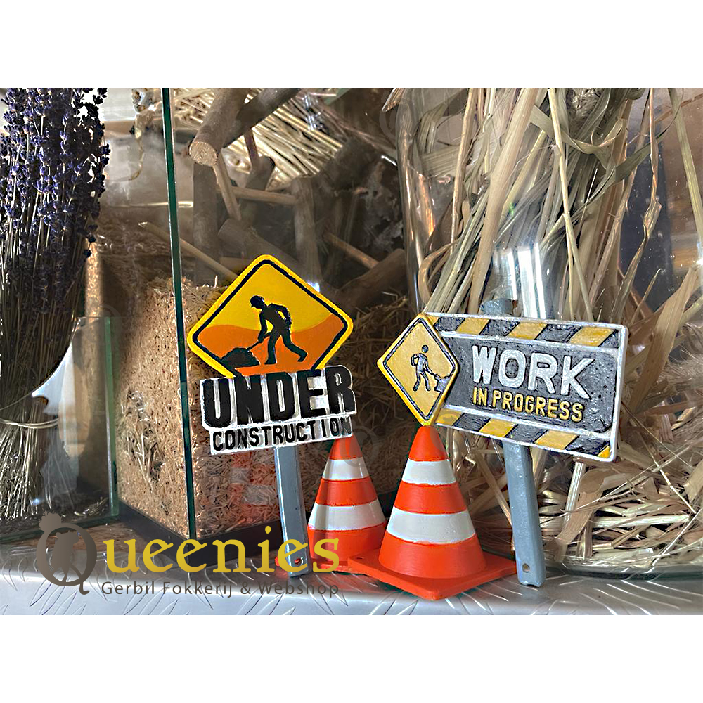 Het Work in progress zijn pionnen en verkeersaanduidingen voor in een Hamster Terrarium. Vaak zien we in aquaria veel ornamenten waarmee het aquarium versierd wordt. Voor Knaagdieren wordt dit Hamsterscaping genoemd. Hamsterscaping staat bekend om de natuurlijke leefomgeving van Knaagdieren zo goed mogelijk na te bootsen. Maar Hamsterscaping is ook het inrichten van een Terrarium. Zo kan een Hamster Terrarium verschillende thema’s hebben. Met de Work in progress borden kan er een nieuw thema worden bedacht.