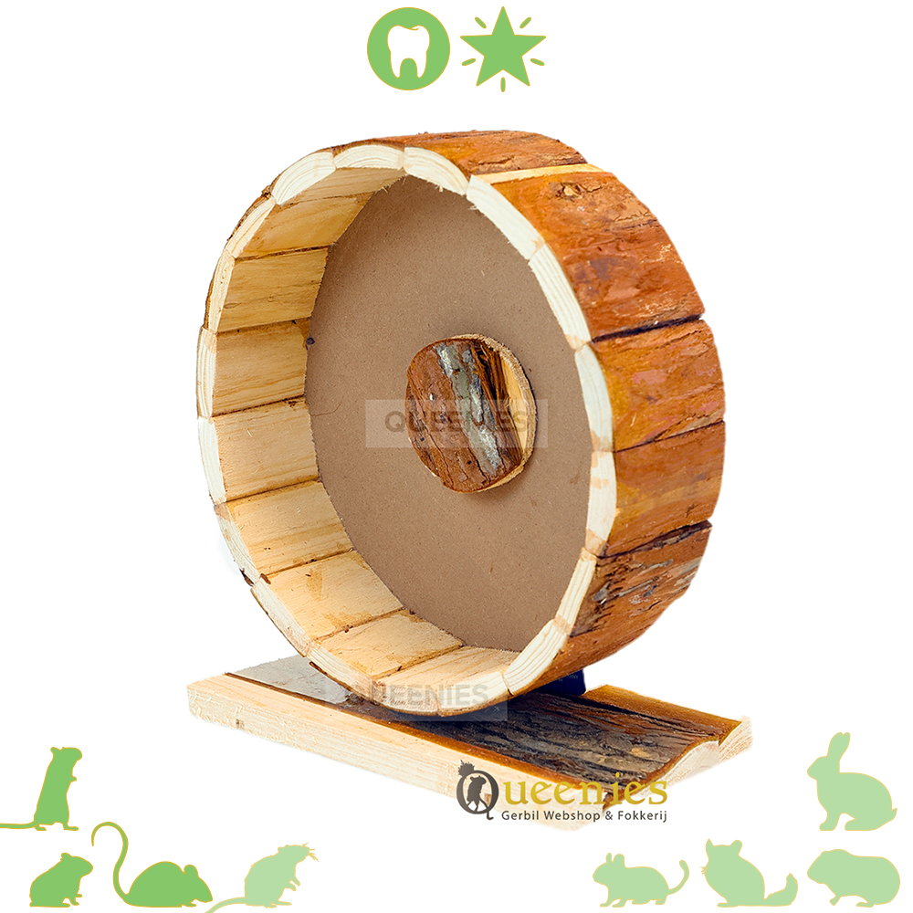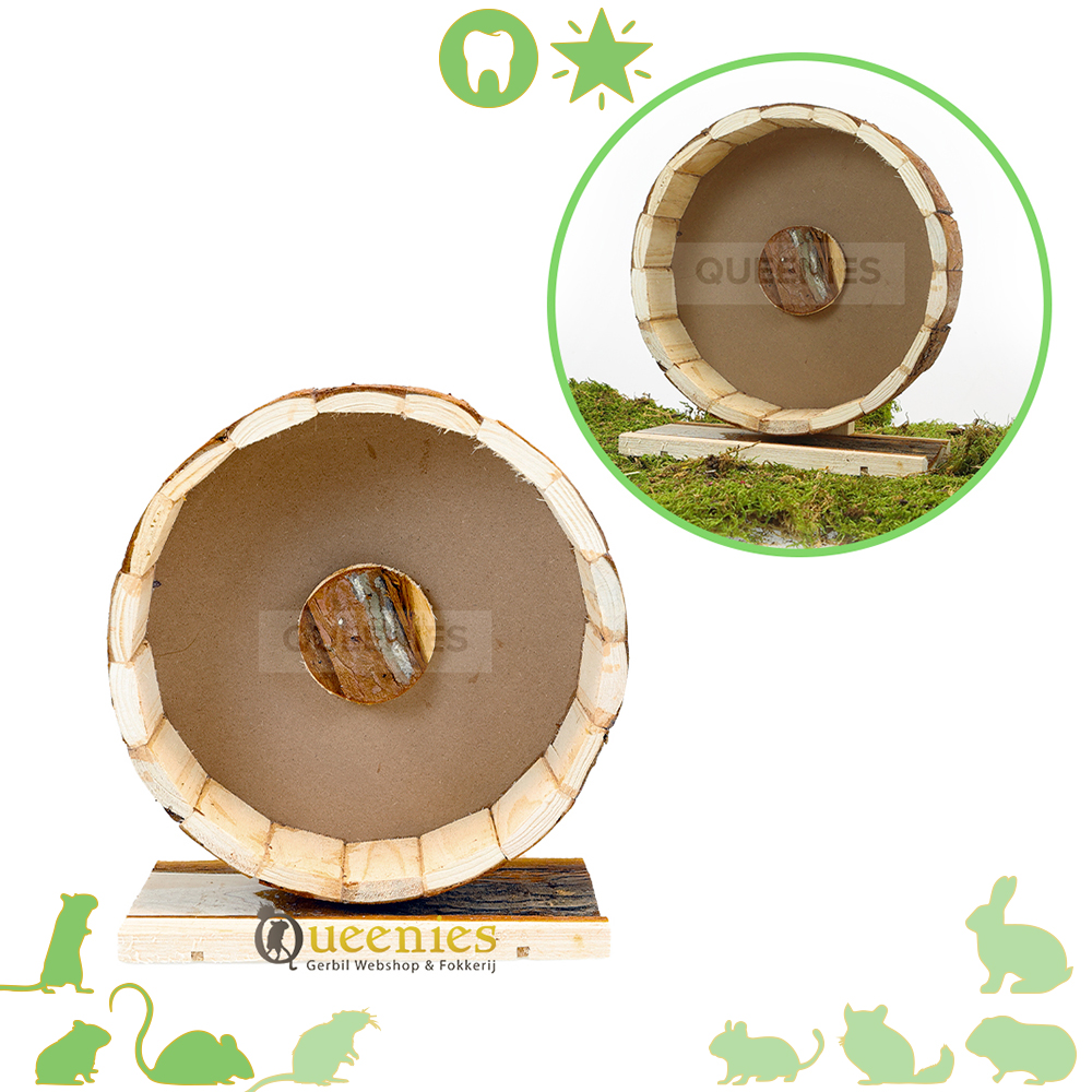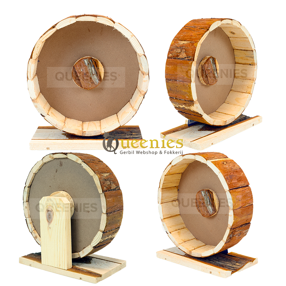 Een houten renrad voor gerbils of andere kleine knaagdieren heeft vaak niet de perfecte slag en is vaak ook niet helemaal stil. Door de kogellagers is dit Houten Renrad in 99 van de 100 gevallen erg stil. Maar u zult altijd geluid blijven horen wanneer uw Gerbil hierin rondrent. Soms is ook een kleine tik of slag zicht en hoorbaar. Het kan voorkomen dat hij niet 100% perfect ronddraait. Dat er een 'boggel' in het loopwiel zit. Dit symboliseert ook de natuur die ook niet altijd perfecte rechte paden heeft. Wel moet het loopwiel altijd rond kunnen draaien op een soepele manier. Wij controleren alle loopwielen die verstuurd worden of dit het geval is. Sommige dieren snappen het loopwiel niet goed. Zij schommelen dan een beetje in het loopwiel. Dit wil niet zeggen dat het loopwiel niet soepel rondgaat. U zal nooit een renrad ontvangen die niet voldoet aan deze eisen. Dit houten Renrad is erg natuurlijk gebouwd zoals aangegeven, daardoor is hij ook niet gelakt of is het hout niet perfect afgeschuurd. Er kunnen verdwaalde splinters in het hout zitten. Doordat het product niet is gelakt, is het 100% veilig voor uw knaagdier, maar kan er ook urine of nare luchtjes in trekken. Vaak gebeurt dit pas na een lange tijd en is het renrad ook wel een keer aan vervaning toe. Het loopvlak van deze Houten Renrad bestaat uit losse houtjes die aan elkaar zijn gemonteerd door een gleuf en een beetje diervriendelijke houtlijm. Het kan voorkomen dat er kleine spleetjes tussen de houtjes zitten. U hoeft niet bang te zijn dat uw knaagdier zich hier aan openhaalt of aan bezeert.