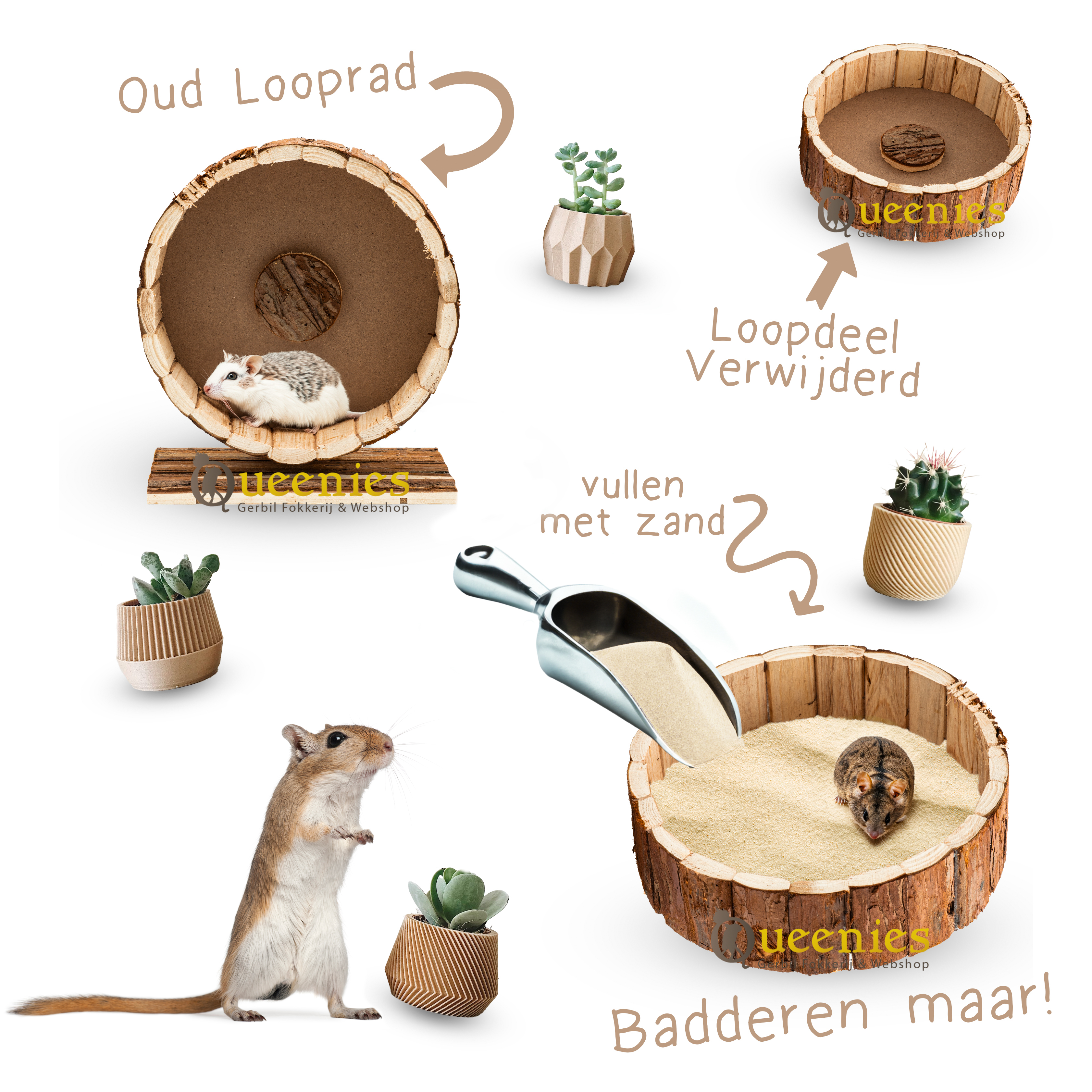 Wanneer u het voet van het houten renrad haalt is het ook leuk te gebruiken als badzandschaal. Wanneer u het looppervlak ook van de arm afhaalt zal deze stabiel blijven liggen. Als u de arm laat zitten is het ook nog een leuke draaimolen tijdens het badderen van de gerbils. Hilarische tafarelen geeft dit.