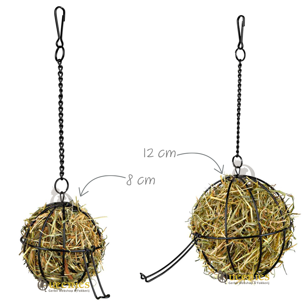 De grote Hooi bal van 12 cm geeft om die reden veel extra uitdaging wanneer de bal schommelt en de dieren echt moeite moeten doen voor hun voedsel.