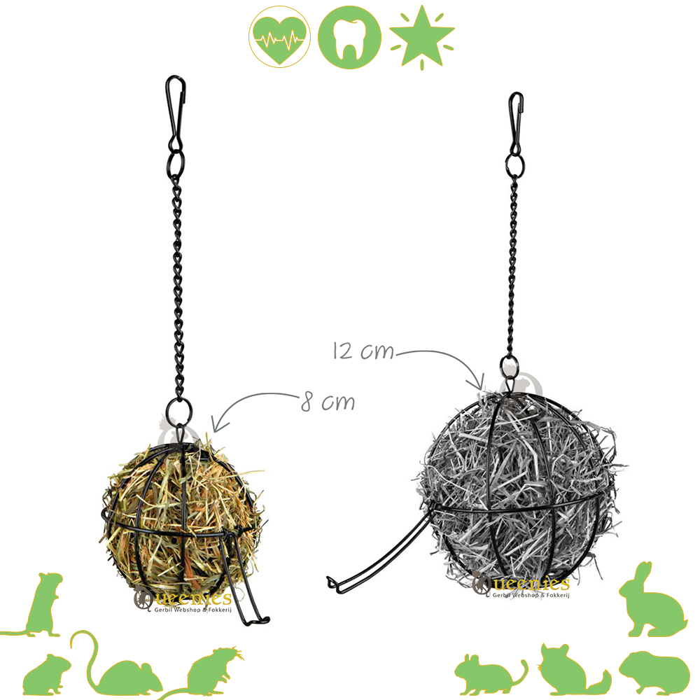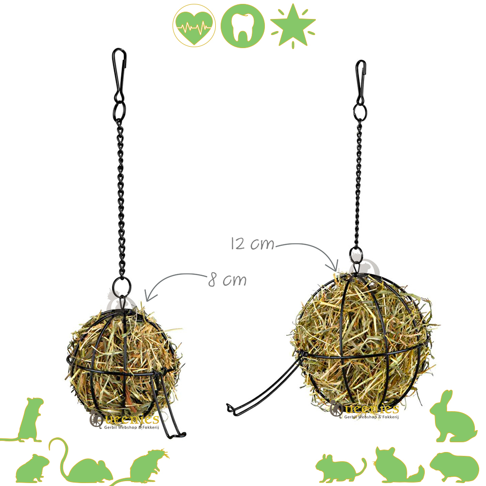 Naast hooi kunt u er ook lekkere snoepjes in verstoppen tussen het hooi door. Dit zal de aandacht van uw knaagdier trekken om lekker aan de gang te gaan met deze interessante hooibal voor kleine knaagdieren.