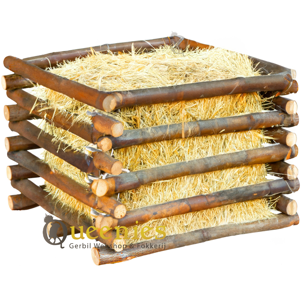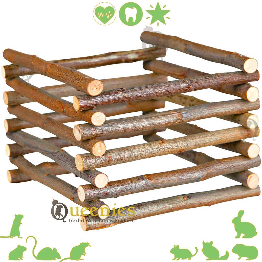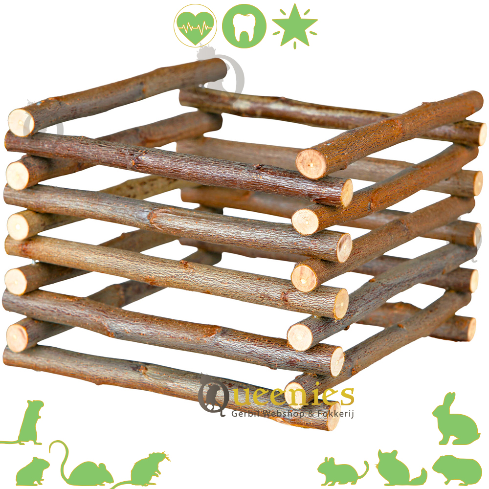 Afmetingen: 15 × 11 × 15 cm ( 11 cm hoog ) afstand spijlen is ongeveer 0,5 cm Materiaal: Natuurlijk schorshout Geschikt voor: Kleine knaagdieren zoals Gerbils, Dwerghamsters, Muizen. Het kan ook gebruikt worden bij Cavia's en Konijnen, Degoes en Chinchilla's wanneer u het hooi in kleinere porties wilt aanbieden