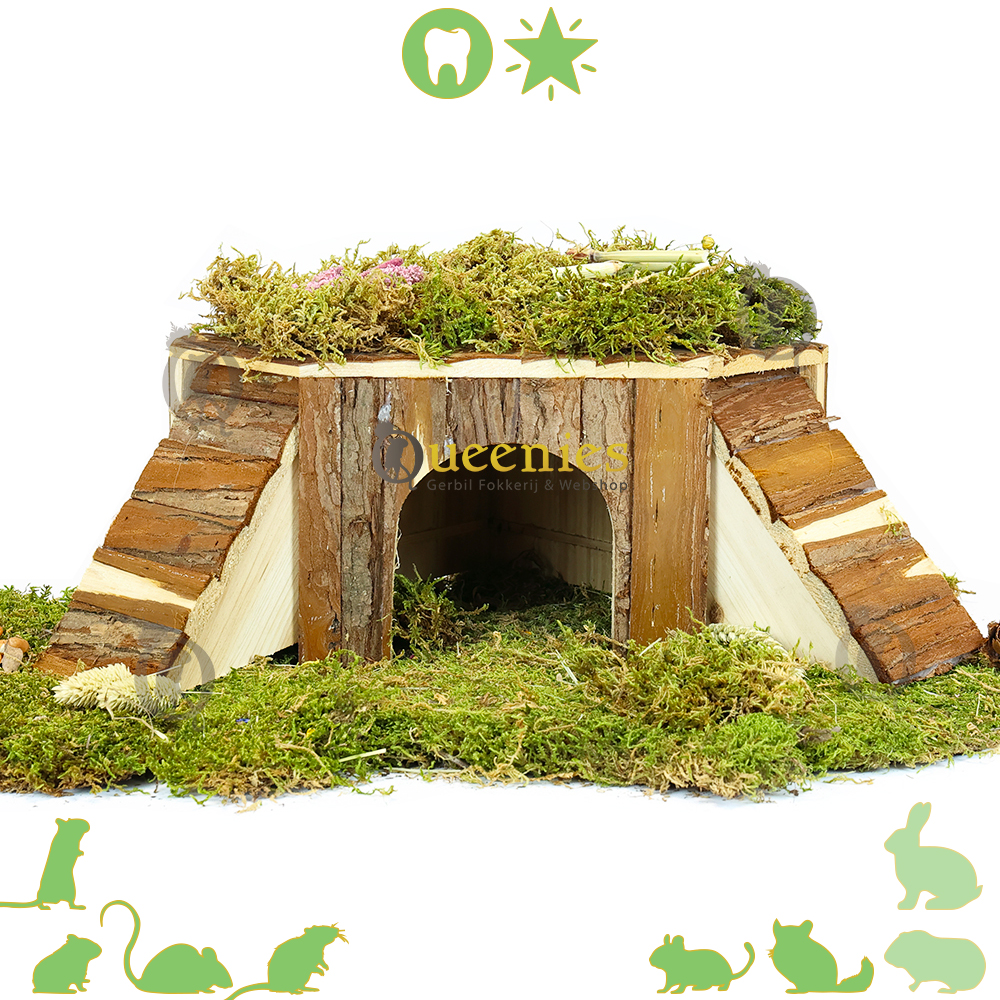 Wij zijn fan en voorstander om wat Gedroogd Terrarium Mos op het dak en rondom het knaagdieren huisje te leggen, dat geeft een zeer mooie natuurlijke uitstraling aan het huisje en past perfect in een natuurlijke inrichting!