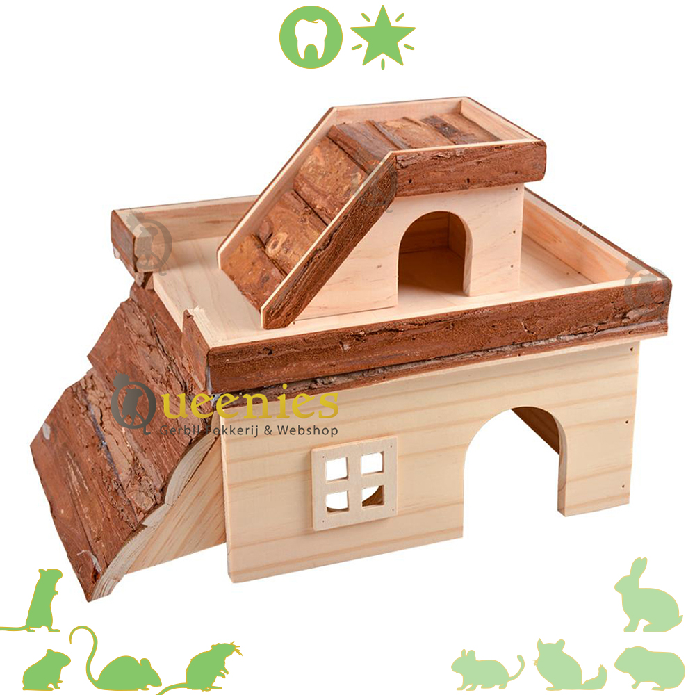 Deze leuke hacienda van duvoplus vervaardigd uit 100% natuurlijk hout maakt het verblijf van je knaagdier compleet. Het biedt je diertje een veilige plek waar hij kan rusten, spelen en knagen. Houten speelgoed bevordert bovendien het natuurlijke knaaginstinct en houdt hun tandjes gezond. Door het vele knagen houden ze de groei van hun tanden onder controle. Afmetingen 34x24x22