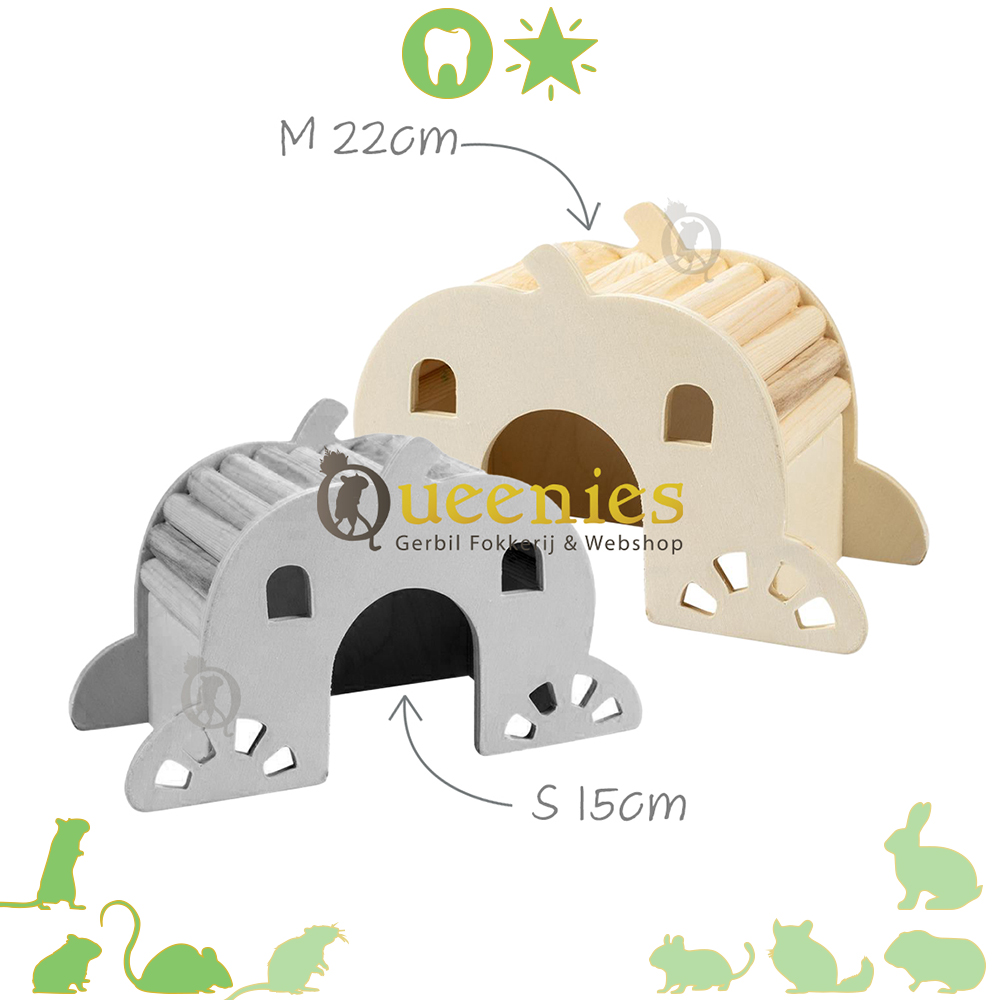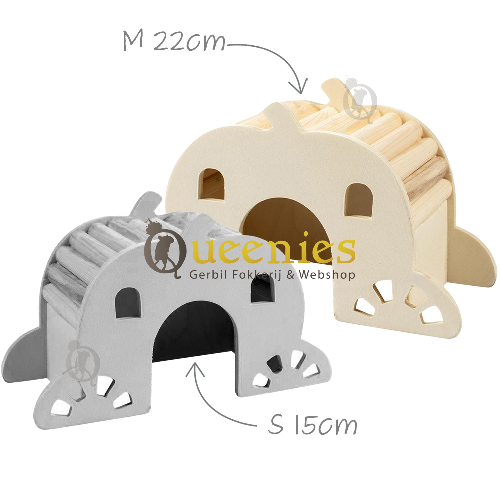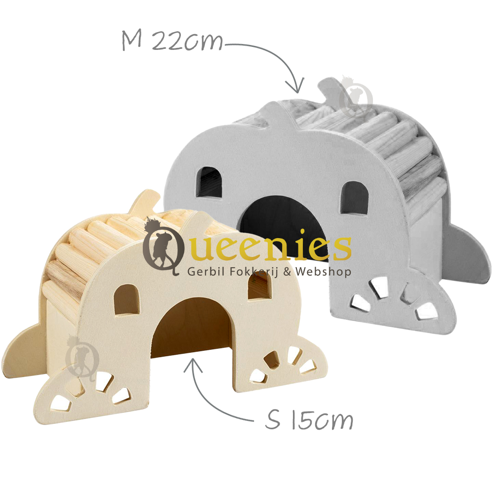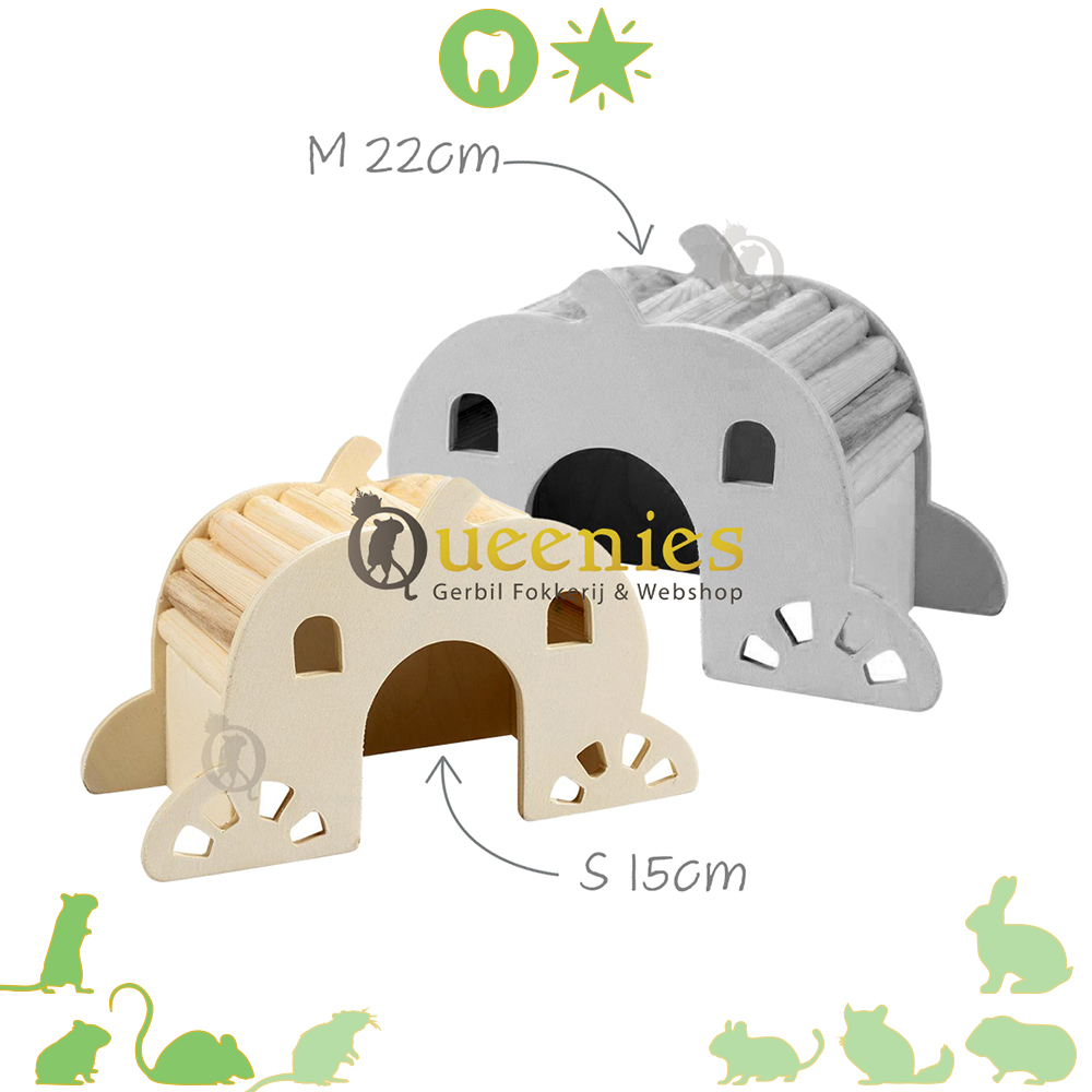 Het Houten Brughuis is verkrijgbaar is twee verschillende maten. In maat S = 15 cm en maat M = 22 cm. Zie voor exacte afmetingen de specificaties. Allebei de huisje zijn geschikt voor kleine Knaagdieren zoals Gerbils, Hamsters, dwerg en Goudhamsters plus Muizen.