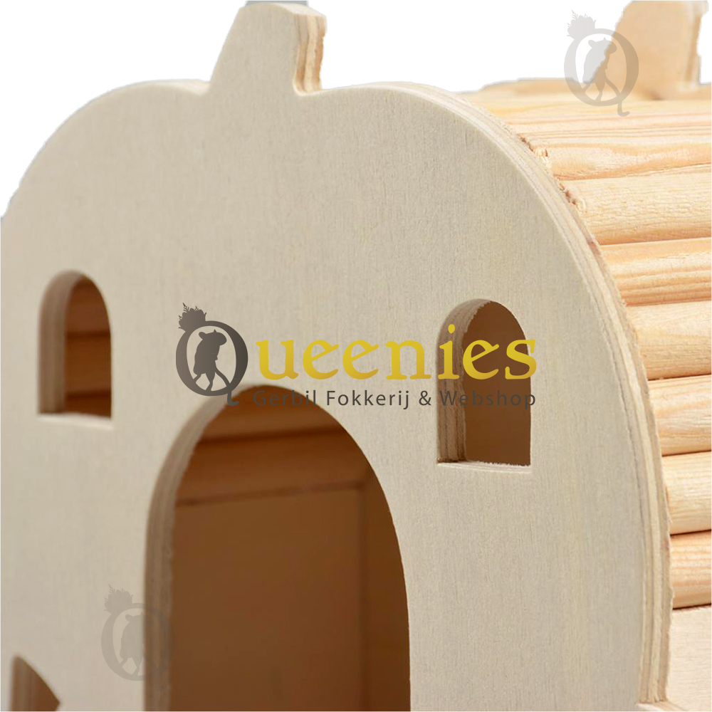 Het Houten Brughuis van 15 t/m 22cm voor kleine Knaagdieren zoals Gerbils en Hamsters, is gemaakt van natuurlijk hout. Het hout geeft een rustieke uitstraling aan het Houten Brughuis. Waardoor het huisje super goed past in een Hamsterscape. Ook heeft het Houten Brughuis een heel leuk ontwerp. Het is multifunctioneel te gebruiken als huis of schuilplek en als brug / ladder naar hogere delen in het Hamster Terrarium!