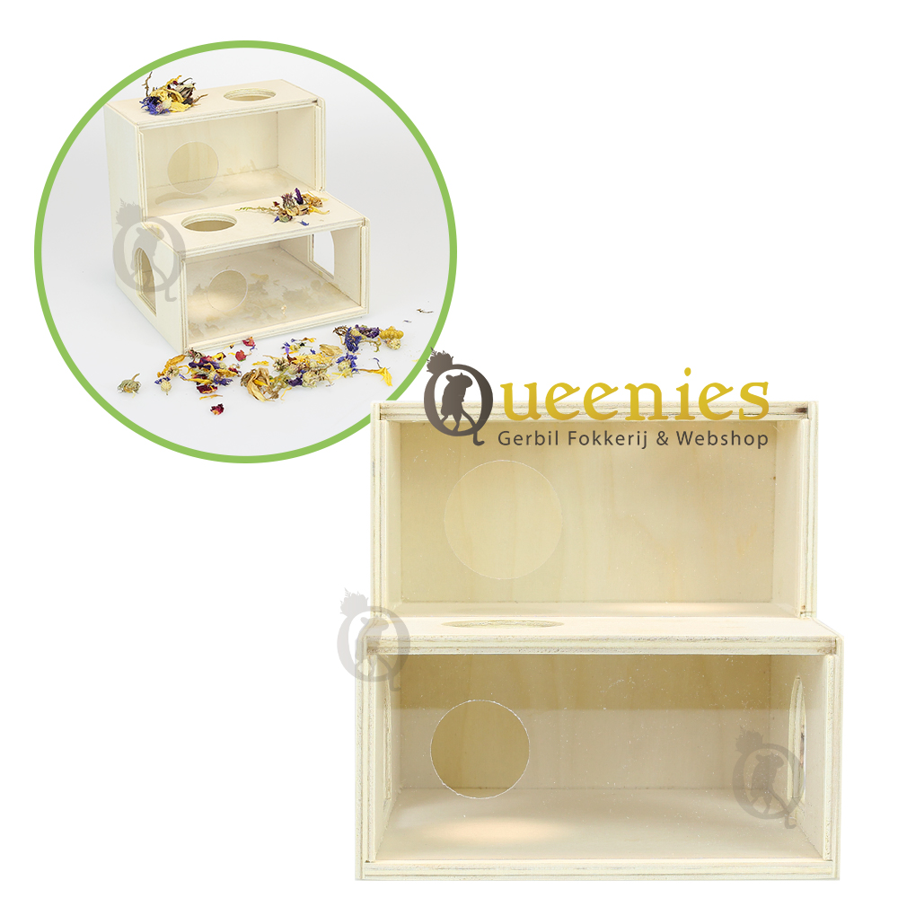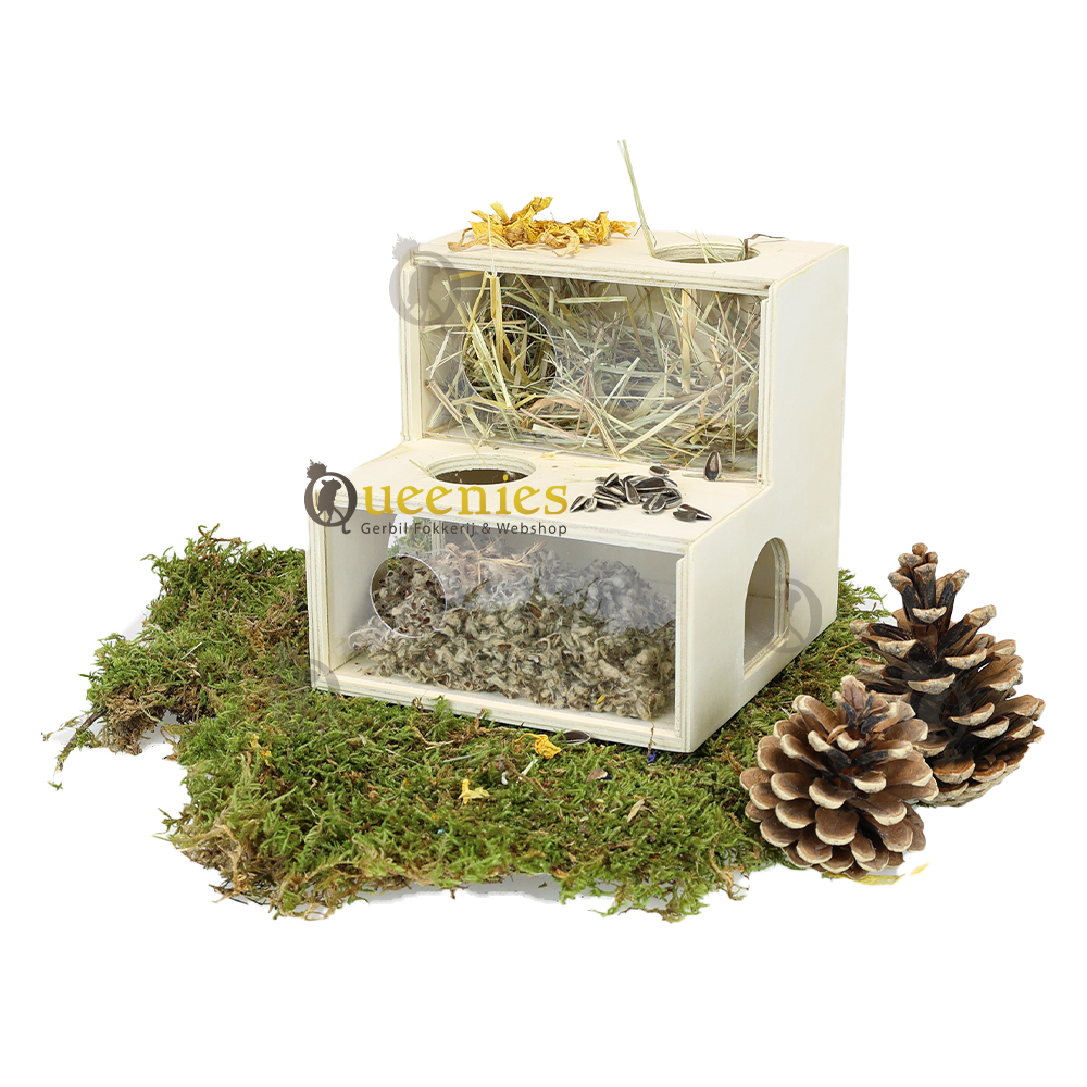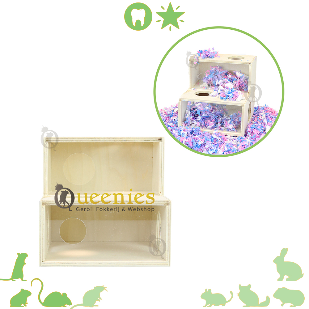 Het Houten huis met grote ramen, biedt niet alleen een schuilplaats. Maar Knaagdieren kunnen het huisje ook gebruiken om mee te spelen. Door de meerdere doorgangen in het Houten Huis kunnen de Knaagdieren zoals, Gerbils, Hamsters en Muizen leuk op onderzoek uit gaan. Ook kunnen de kamers gevuld worden met bodembedekking of op andere manieren worden opgevuld. Voor Gerbils is het mogelijk om holletjes en tunnels te maken in het huisje zelf. Door de twee grote ramen kunnen wij meekijken hoe dat tunnelsysteem wordt gemaakt.