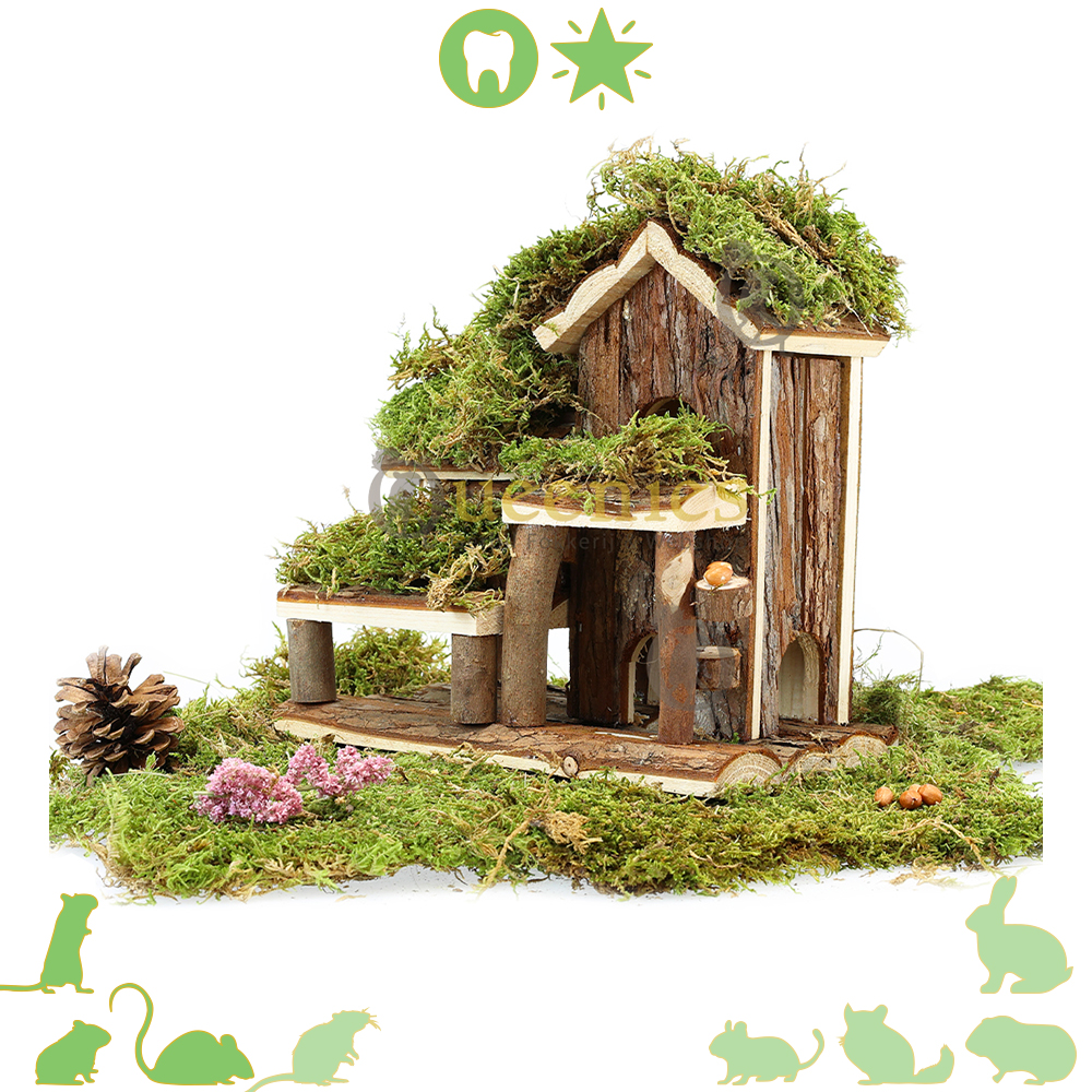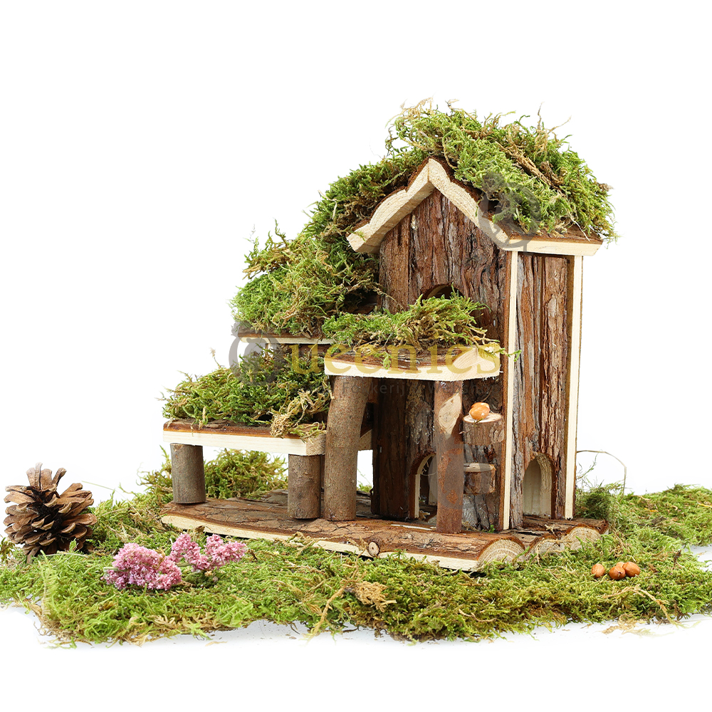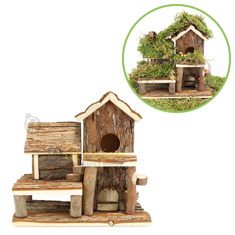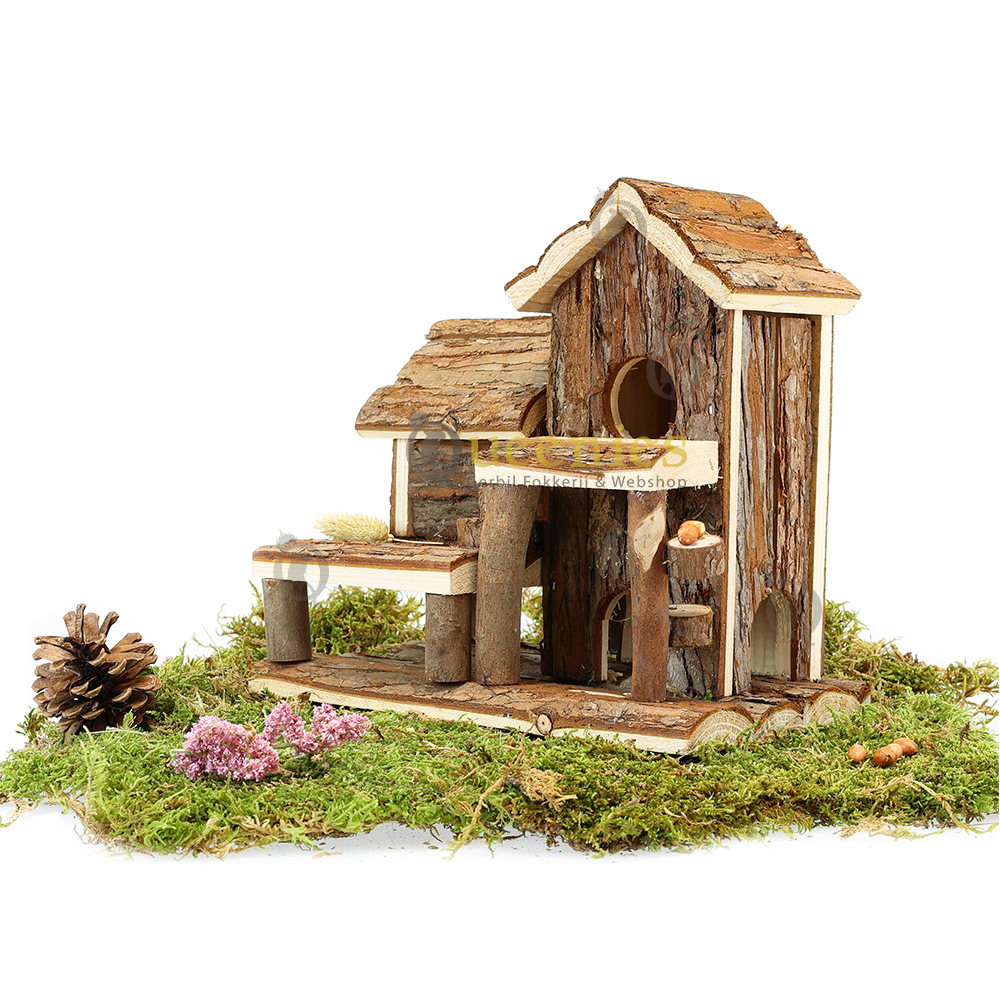 Voeg zelf nog wat Gedroogd Terrarium mos toe op de daken van dit huisje en op de balkonnen en het oogt direct klaar voor gebruik in een natuurlijk ingericht Hamster Terrarium.