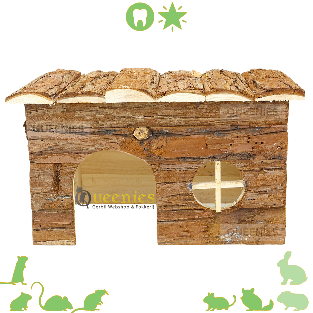 Huisje Jerrik is een mooi Blokhut huisje voor Knaagdieren met een plat dak. Vanwege het de afmetingen en de vorm past dit mooi Degoe huisje in iedere hoek van het Terrarium / Gerbilarium en heeft u geen loze ruimte. Past in ieder knaagdieren verblijf qua uitstraling. Zeker bij Hamsterscaping komt dit effectieve huisje goed van pas. Als u een Syrische Hamster heeft ( Goudhamster ). Goudhamsters zijn vaak toch redelijk aan de maat, Blokhut huisje Jerrik is dat ook waardoor er plek genoeg zal zijn voor een Goudhamster. Jerrik is een degelijk ontwerp met maar ontzettend leuk en handig in gebruik! Er kunnen dingen opgezet worden vanwege het platte dak. Denkt u dan bijvoorbeeld aan een voerbakjes, badzand schalen of waterschalen. Maar ook kunt u een houten renrad vast monteren op het dak van dit huisje Jerrik zodat het renrad vrij staat van bodembedekking zodat het loopwiel niet ingegraven kan worden. Ook ontstaat er op die manier een windmolen idee wat dan weer erg leuk terugkomt in de Hamsterscaping.