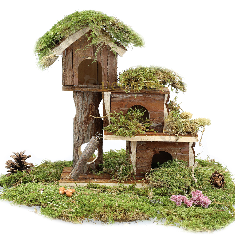 Gerbils zijn erg ondernemende dieren die de hele dag op ontdekking zijn of iedere dag weer opnieuw op ontdekking gaan in hun Gerbilarium. Hetzelfde geldt voor andere knaagdieren zoals hamsters en muizen. Hamsters gaan voornamelijk snachts erop uit. Muizen en Gerbils zijn de hele dag onderweg en in de weer. Knaagdierhuisje Tammo biedt uw huisdier hierbij de mogelijkheden doordat het trapsgewijs is opgebouwd. Het eerste huisje op de begane grond heeft een opening in de bodem. Vanaf verdieping 1 gaat uw knaagdier op onderzoek uit of er nog lekkere snoepjes of snacks zijn verstopt in het huisje, naar verdieping 2 die via het houten trapje ook kan worden bereikt. Dit 2e huisjes op de middelste verdieping, heeft een opening aan de zijkant. Dankzij deze opening kan de boomstamtunnel ook hier worden bereikt. Een beetje rondscharrelen over het gedroogde terrarium mos wat u daar heeft neergelegd en vervolgens het snackje op verdieping 3 te nuttigen en daarna even van het uitzicht te genieten. Vanaf verdieping 3 kan uw knaagdier door de tunnelbuis naar beneden. Ook kunnen uw Gerbils of hamsters via de boomstamtunnel vanaf de bodem naar verdieping 3, de hoogste verdieping van dit huisje, klimmen. De tunnelbuis kan dus vanaf alle verdiepingen gebruikt worden.