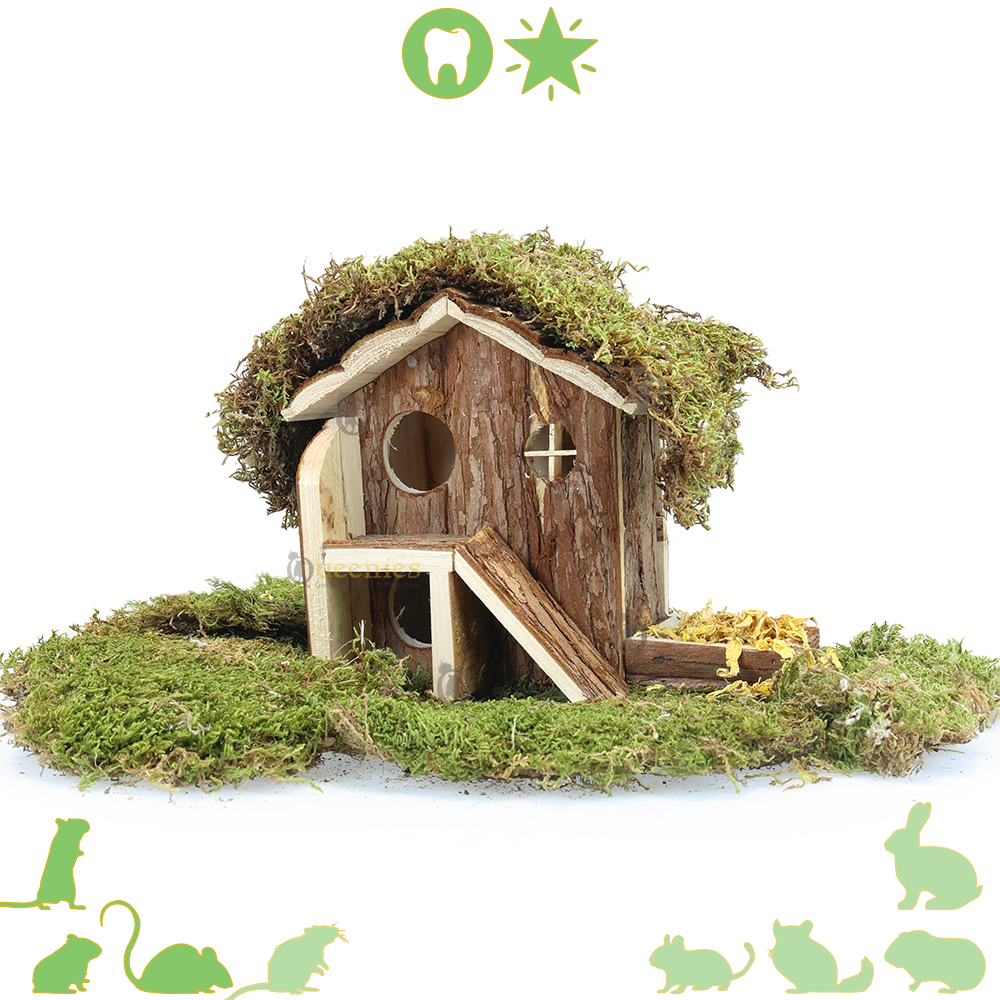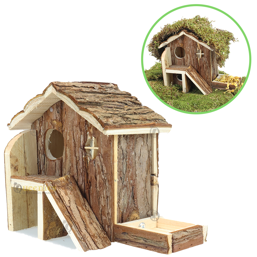 Het Muizen huis Henna is een Knaagdier huisje speciaal gemaakt met een extra houten voerbak. Dit is ideaal, niet alleen hebben de Muizen met dit Henna huisje een schuilplek, maar kunnen de Knaagdieren ook gelijk gebruikt maken van de extra voerbak aan de zijkant. U kunt deze bak gebruiken als voerbak of als snackbak. Het is niet geschikt als waterbak, maar er zou wel weer wat badzand in gedaan kunnen worden. niet dat de Gerbils of muizen hierin kunnen badderen, maar het geeft wel een mooie uitstraling aan het huisje. Dit maakt dit huisje uniek wat veel meer voordelen en mogelijkheden biedt dan andere Knaagdieren Huisjes.