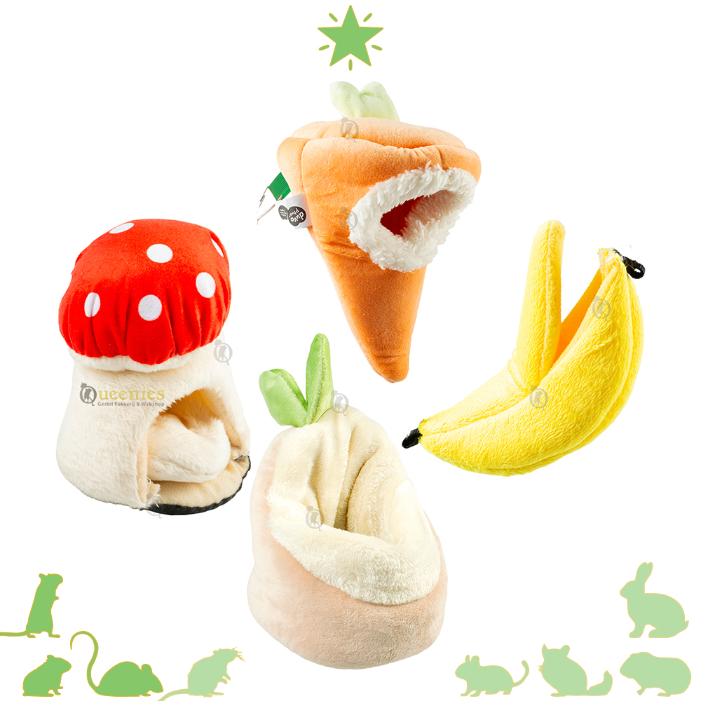 De Pluche Huisjes zijn gemaakt voor kleine Knaagdieren in 4 verschillende vormen zijn het lekker zachte slaapplekken. Het Paddenstoel, Boomstam, Wortel en Bananen huisjes zijn superleuk om een Terrarium mee op te fleuren. Niet alleen zijn de huisjes lekker zacht van binnen om het ultieme comfort te bieden voor de Knaagdieren, het Wortel en Bananen huisje kunnen ook opgehangen worden wat het leuk maakt voor Gerbils om in te klimmen. Elk huisje is gemaakt met het welzijn van Kleine Knaagdieren zoals Hamsters en Gerbils in gedachten, dus niet alleen zien het huisje er superleuk uit. Hamsters kunnen het ook gebruiken als schuilplaats.