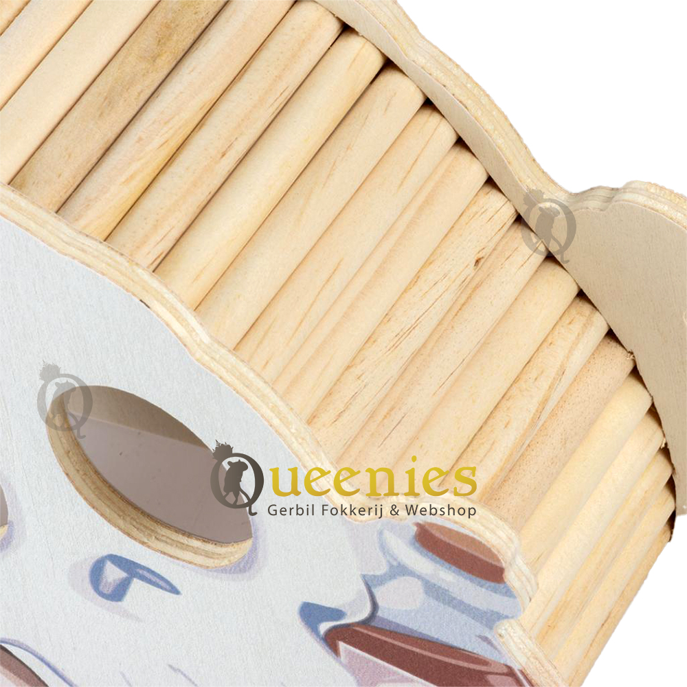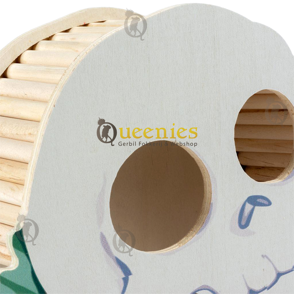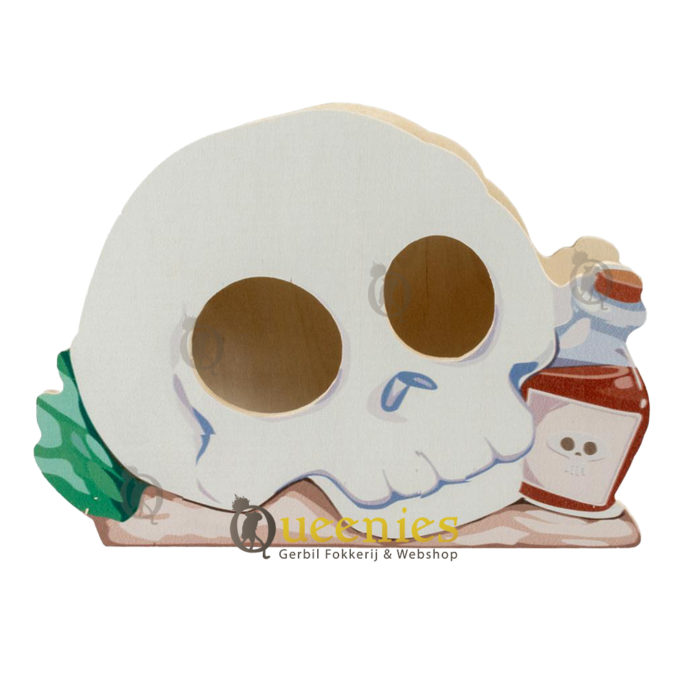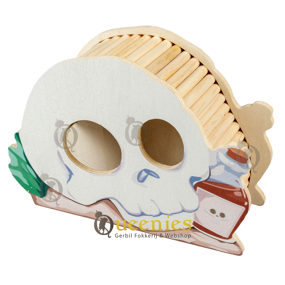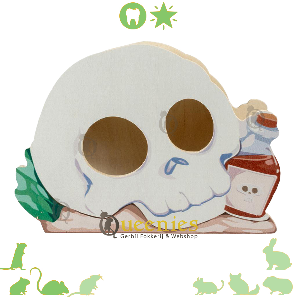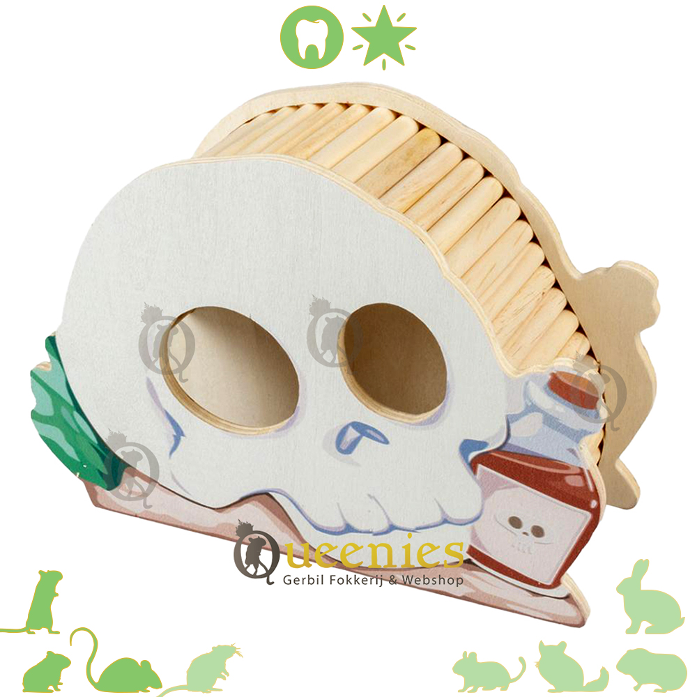 Knaagdieren Speelhuisjes zijn zoals de naam misschien al verklapt, leuk voor Knaagdieren om in/mee te spelen. Knaagdieren zoals Gerbils, Hamsters en Muizen kunnen het huisje verkennen, erop klimmen, gebruiken als slaap/schuilplaats en elkaar achtervolgen door de meerdere openingen in het huisje. Het Schedel Speelhuisje is gemaakt van hout en daarom veilig voor Gerbils om aan te knagen. De tanden van Knaagdieren groeien erg snel. Daarom is het belangrijk om deze goed bij te houden. Producten dat gemaakt zijn van hout helpen mee aan het slijten van de tanden om een natuurlijke wijzen.