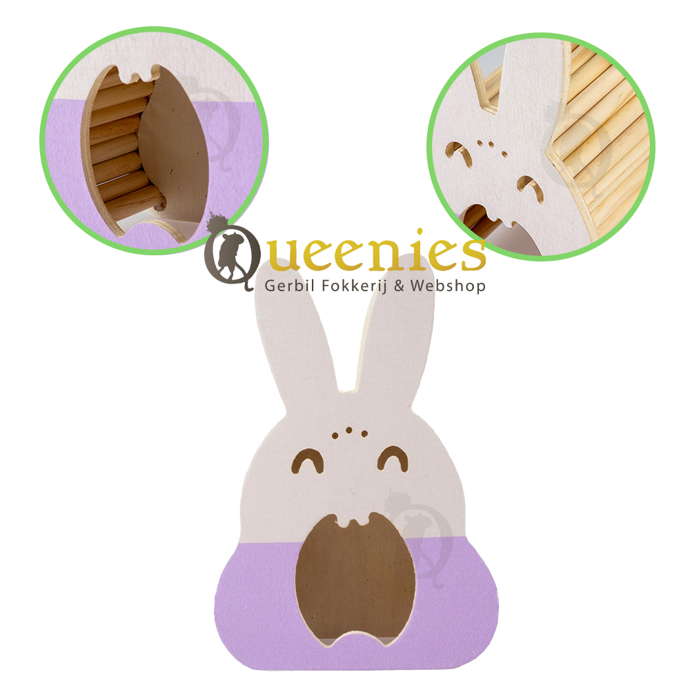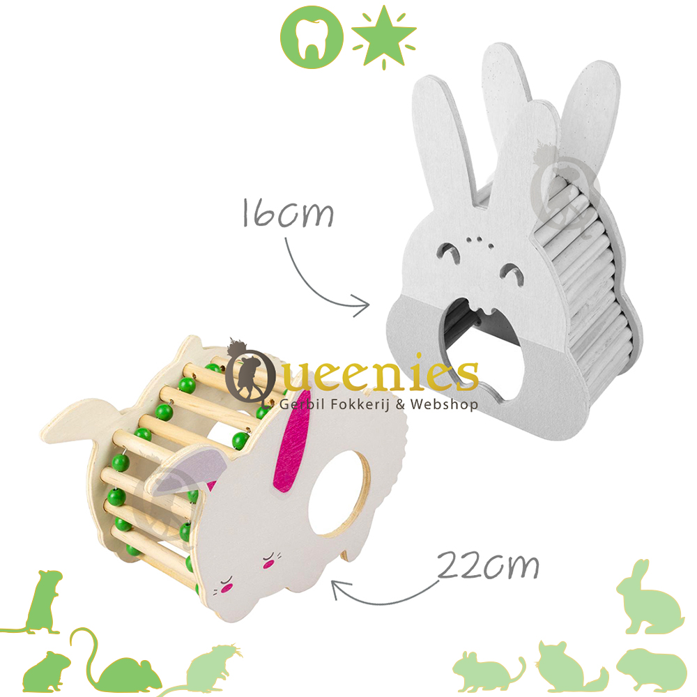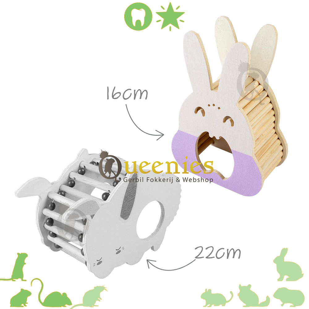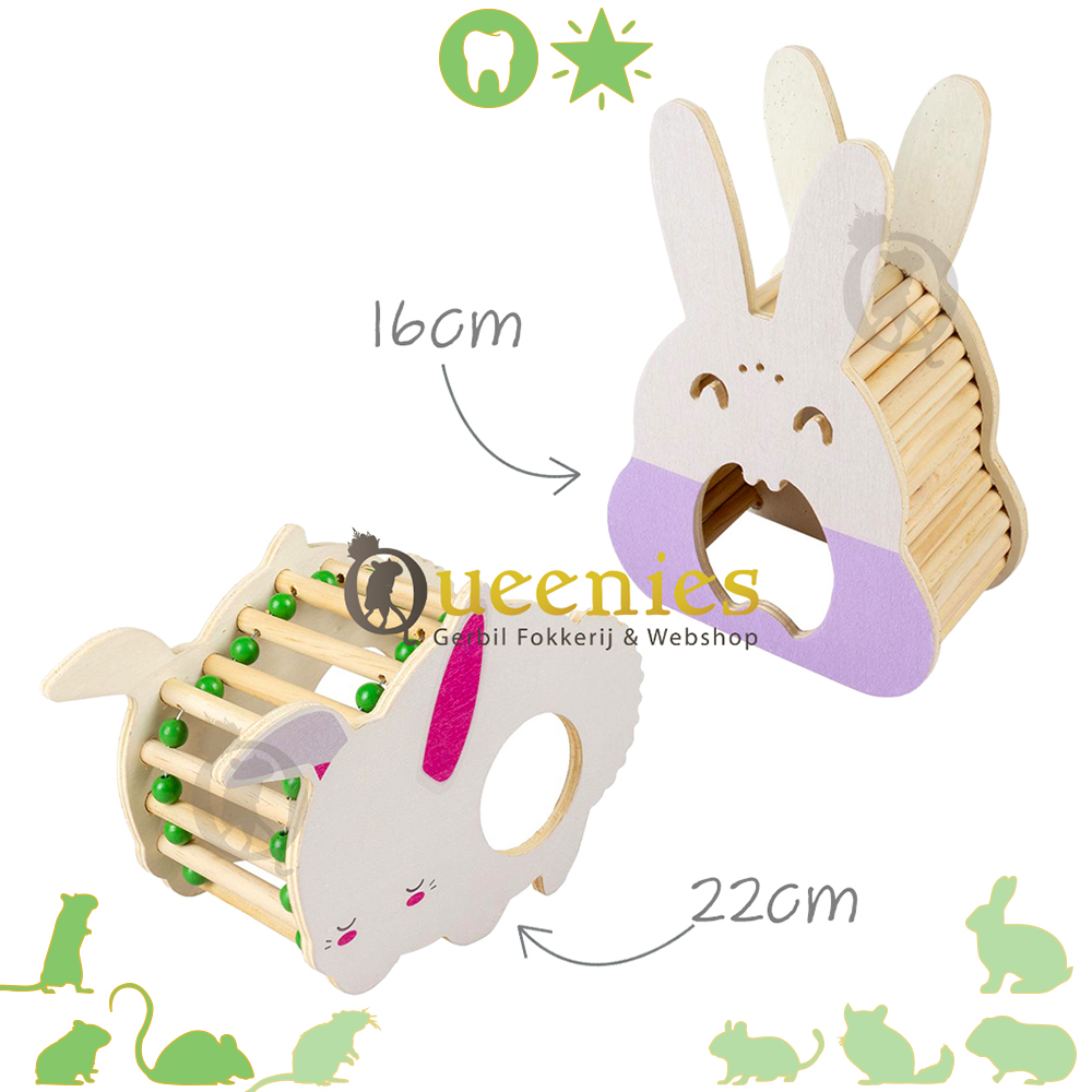 Dit Speelhuis Konijn design is voor kleine Knaagdieren gemaakt. Niet alleen is het Konijn Speelhuis in twee verschillende variaties beschikbaar, het is ook een leuke toevoeging aan een Terrarium / Gerbilarium. Samen met de Gerbils, Hamsters en Muizen kan er nu ook een Konijn in het zelfde Terrarium verblijven. Het Speelhuisje is van hout gemaakt de twee verschillende Konijnen variaties zijn leuk vormgegeven op verschillende manieren.