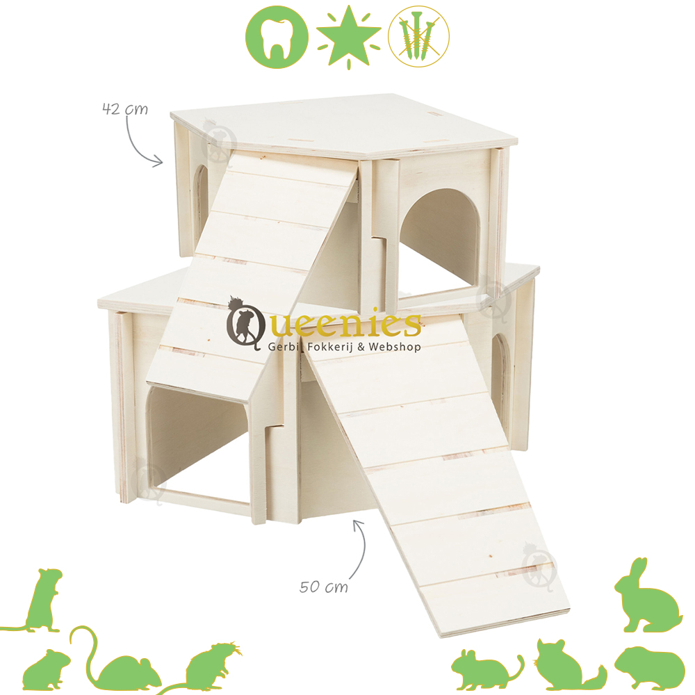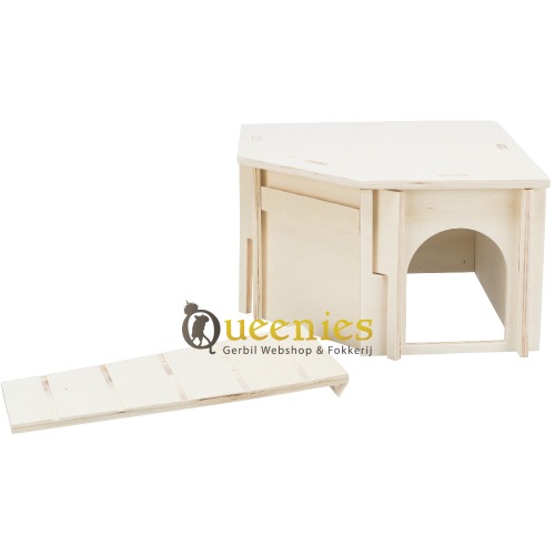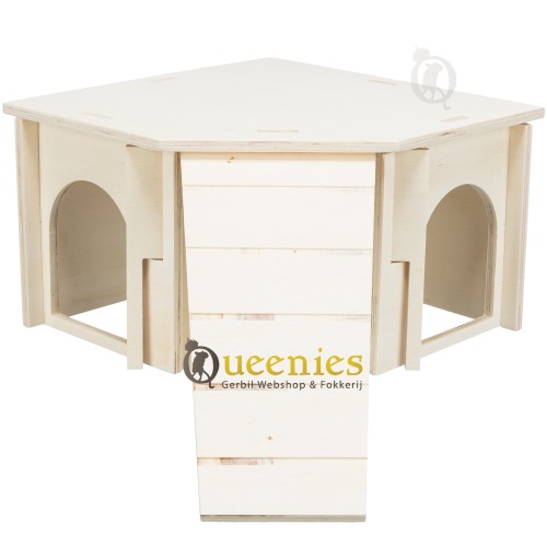 Het Trixie Hoekhuis Thore is spijkervrij en gemaakt voor Knaagdieren of Konijnen. Met 2 ingangen en een trap naar het platte dak biedt dit Knaagdier hoekhuis een hoop mogelijkheden voor u als baasje, en natuurlijk ook voor uw huisdier. Hoekhuizen, of producten die in hoeken geplaatst worden hebben een groot efficient voordeel in een Knaagdierenkooi. Zo benut u loze ruimte door dit hoekhuis in de hoek van uw Terrarium / Gerbilarium te plaatsen. Het platte dak biedt ook veel mogelijkheden om daar water of voerschalen op te zetten, of zelfs een Houten renrad.