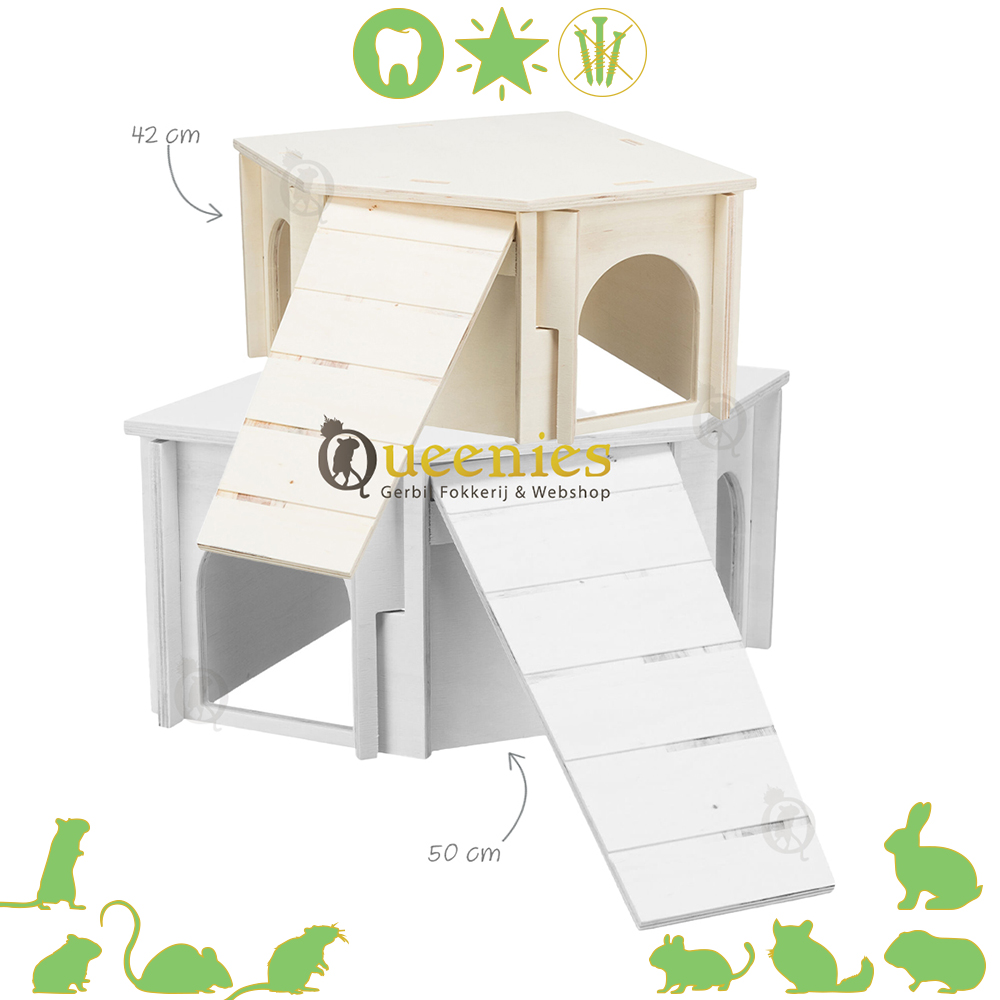 Afmetingen: 30 x 30 x 18 cm│40 x 40 x 23 cm Openingen: Ø 10 x 13 cm│Ø 14 x 16 cm Materiaal: Blank natuur hout Geschikt voor: Knaagdieren en Konijnen