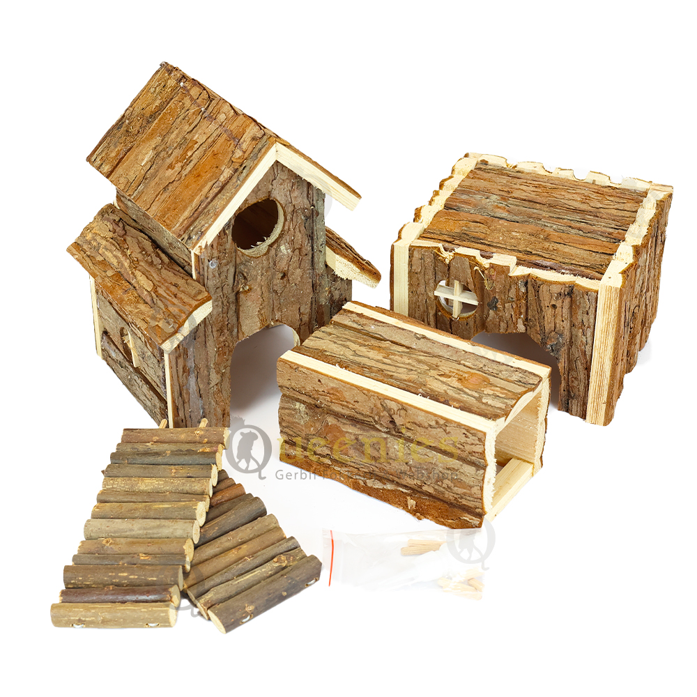 Gerbils zijn groepsdieren en daardoor krijgen wij wel eens de vraag of een dergelijk huisje wel goed is voor een Gerbil. Is er geen risico dat ze zich gaan afzonderen van elkaar omdat het 2 huisjes heeft. Daar hoeft u niet bang voor te zijn. groepsdieren kunnen wel apart van elkaar spelen, maar zullen nooit apart van elkaar gaan slapen. Deze 2 huisjes, en met name het rechter huisje biedt voldoende ruimte en mogelijkheden om met een lekkere groep samen te slapen. Wanneer u meer dan 6 kleine groepsdieren bij elkaar houdt raden wij wel aan om een grotere huisje ook in het Terrarium / Gerbilarium te plaatsen. Sowieso mag u altijd meerdere huisjes in een knaagdierkooi zetten.