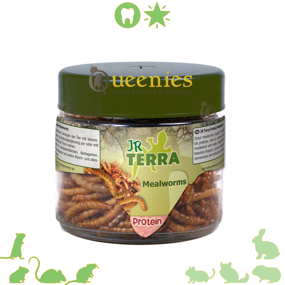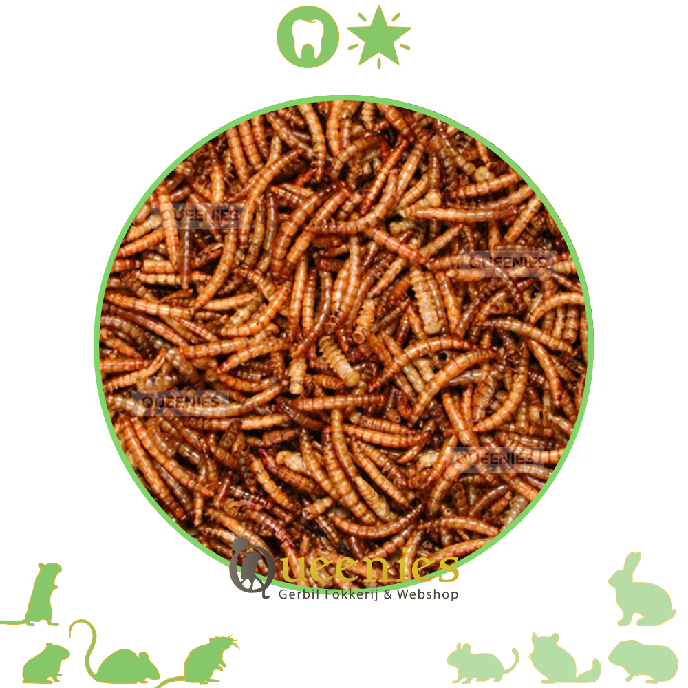 Gedroogde meelwormen zijn een gezonde en lekkere snack voor Gerbils of andere knaagdieren. Boordevol proteïen en dierlijke eiwitten wat essentieel is voor zwangere Gerbil dames. Het bevorderd de melkproductie opgang te komen. Wanneer u geen zwangere knaagdieren heeft hebben Gerbils en met name Dikstaart Gerbils eiwitten nodig. Vrijwel alle knaagdier voedigen bevat gedroogde meelwormen. Zeker voer voor Hamsters, Dwerghamster, Goudhamster, Ratten en muizen hebben een eiwitrijk dieet. Daarom zijn deze gedroogde meelwormen ook een perfecte aanvulling op de dagelijkse voeding! Gedroogde meelwormen zijn een perfect alternatief als u geen levende insecten in huis durft te halen of deze levend durft of wilt geven.