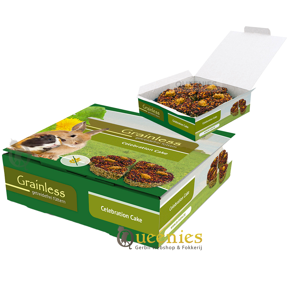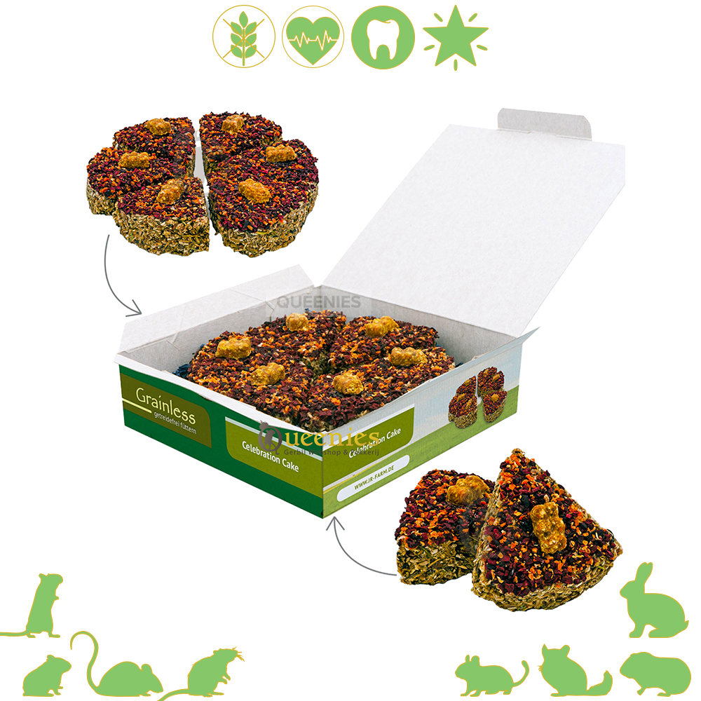 Veel Knaagdieren en Konijnen hebben een gevoelige spijsvertering. Daarom kan het moeilijk zijn voor de Knaagdieren en Konijnen om graan te verteren. Gelukkig is dat bij deze Grainless Feest taart geen probleem omdat er geen granen en zaden in deze taart zijn verwerkt. Ook zitten er meer nadelen aan granen. In granen zit een hoog caloriegehalte wat voor overgewicht kan zorgen bij Knaagdieren en Konijnen, wat natuurlijk niet de bedoeling is.