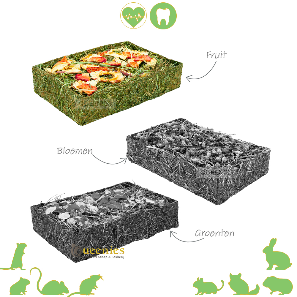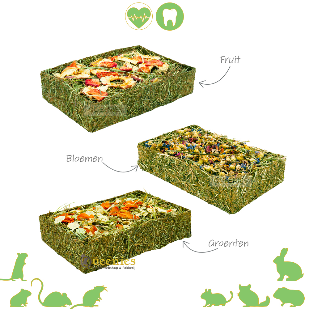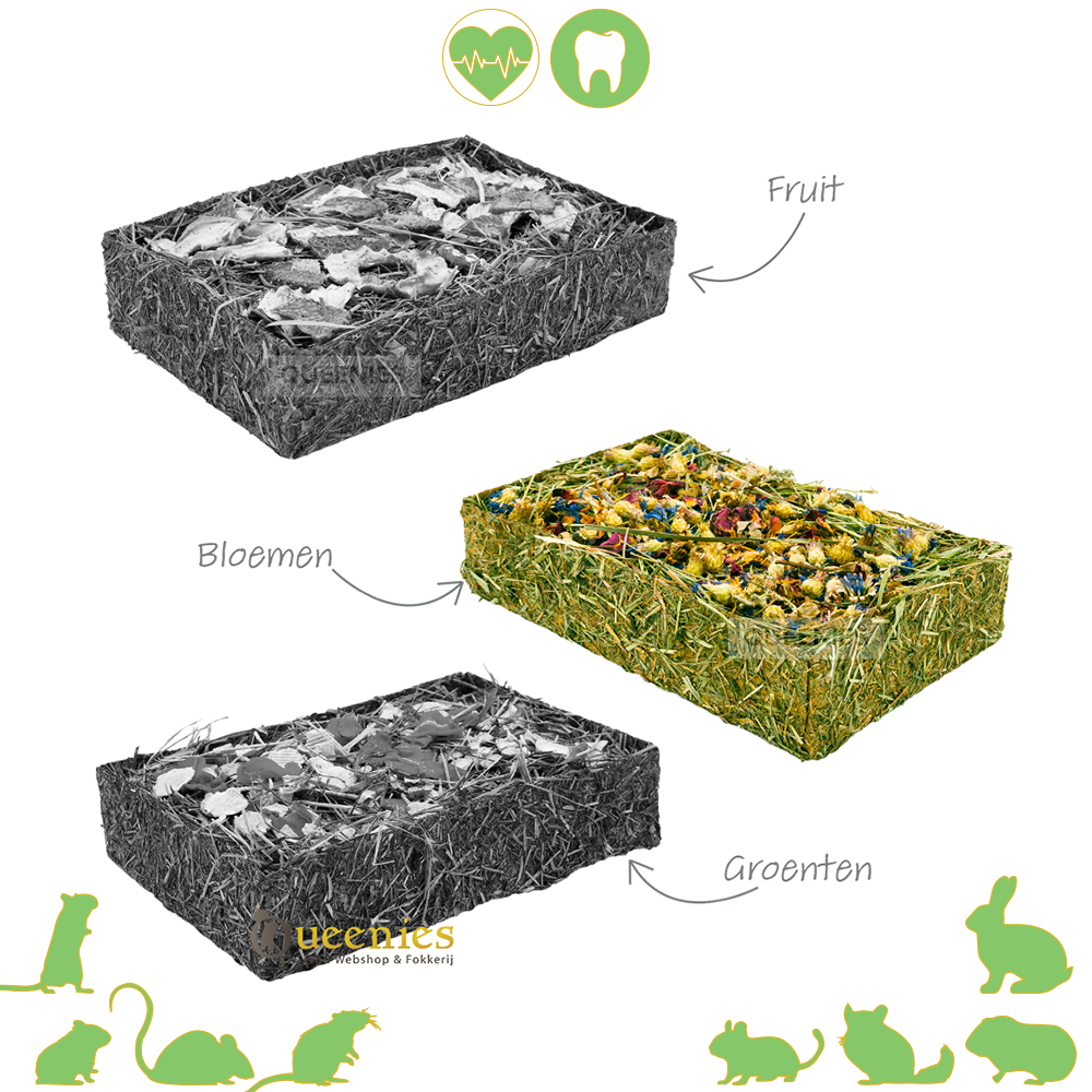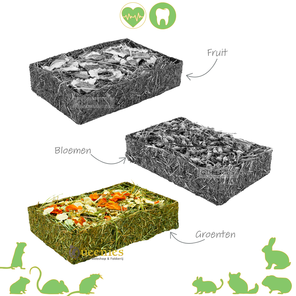 Deze unieke schalen hebben een schatkist van natuurlijke verrassingen! Ze zijn alle zorgvuldig samengesteld uit 100% natuurlijk hooi met veel vezels. Maar wat er als topping is gebruikt verschilt per schaal maar zijn alle 3 ook een waar feestje! Er wacht een rijke schat aan voedzame Gedroogde Groenten, zoet fruit of kleurrijke Gedroogde Bloemen voor Knaagdieren en Konijnen om hen te verrassen en te plezieren.