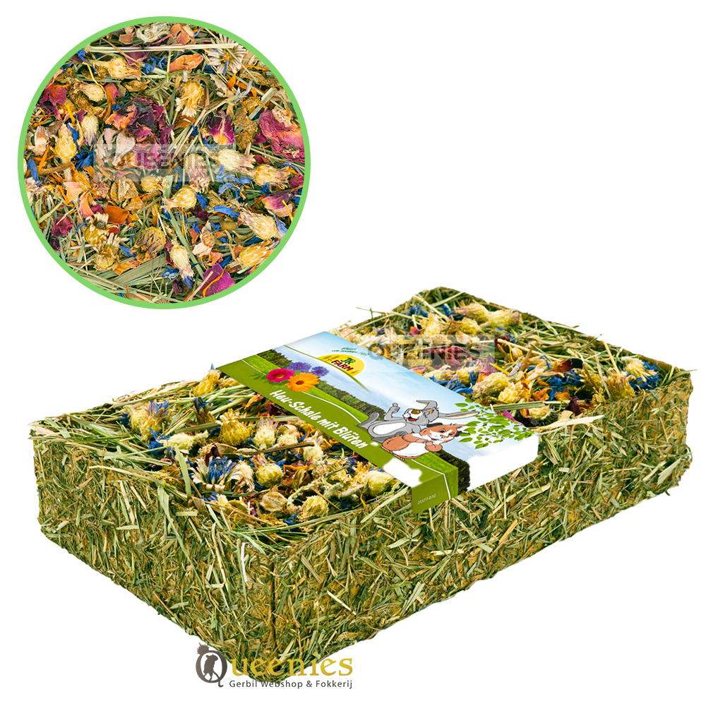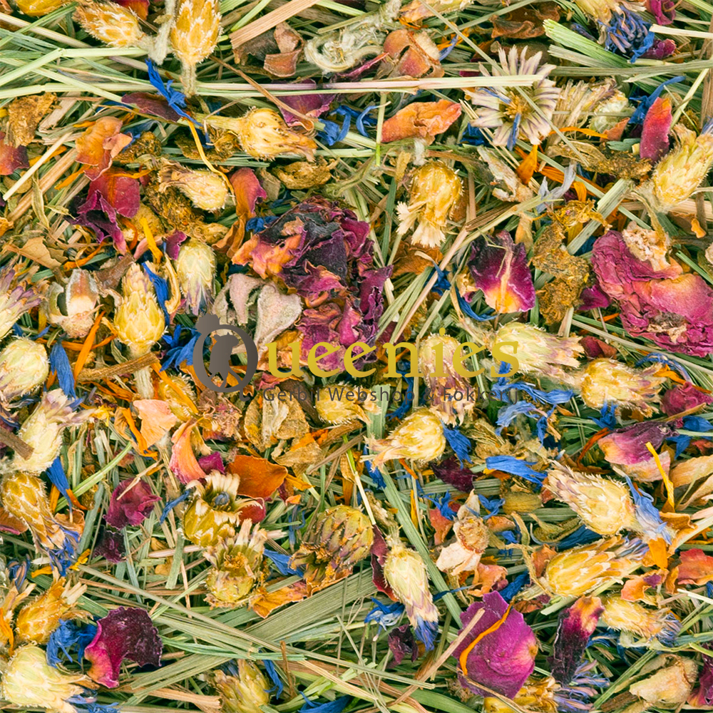Samenstelling Gedroogde bloemen schaal: Bergweidehooi 51,5%, lignocellulose 26,7%, plantaardig zetmeel, rozenbloesems 2,1%, goudsbloembloesems 2,1%, korenbloembloesems 2,1%