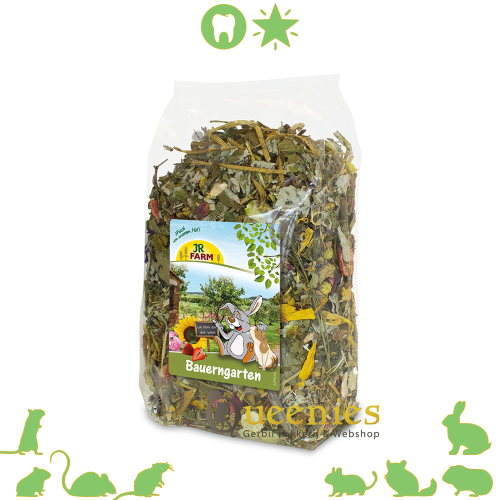 Vers uit de boerderij tuin! Deze mengeling is een ware traktatie en verwent knaagdieren en dwergkonijnen met hun geliefde erwtenvlokken, heerlijke aardbeien, vele aromatische kruiden en heilzame geneeskrachtige kruiden zoals kamille, goudsbloem, zonnebloem, kaasjeskruid, frambozenblad, rozen- en korenbloembloesem.
