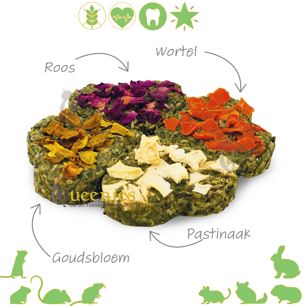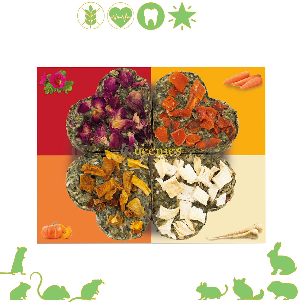 Trakteer uw geliefde knagers op ons Graanvrije Gelukskwartet, een selectie van vier overheerlijke koekjes die elk een unieke smaaksensatie bieden. Deze koekjes zijn niet alleen een genot voor de smaakpapillen, maar ook een gezonde aanvulling op het dagelijkse menu van uw huisdier.