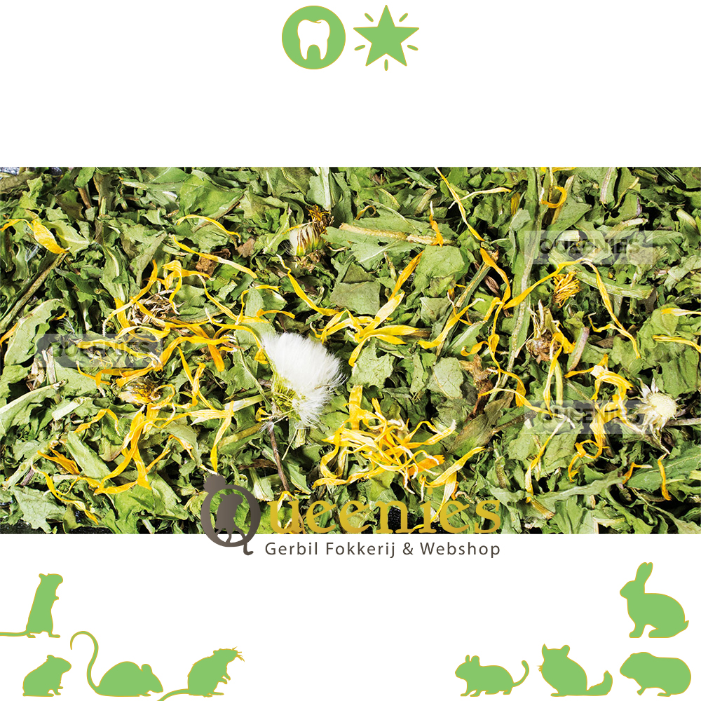 De JR Farm Paardenbloem is een gezonde mix voor elke dag. De paardenbloem - met zijn vele vitaminen, mineralen en sporenelementen - ondersteunt niet alleen de natuurlijke weerstand, maar is ook een favoriete snack aller tijden voor alle knaagdieren. Het hoge gehalte aan ruwe celstof zorgt voor een optimale spijsvertering en verbetert zo het gevoel van welzijn.
