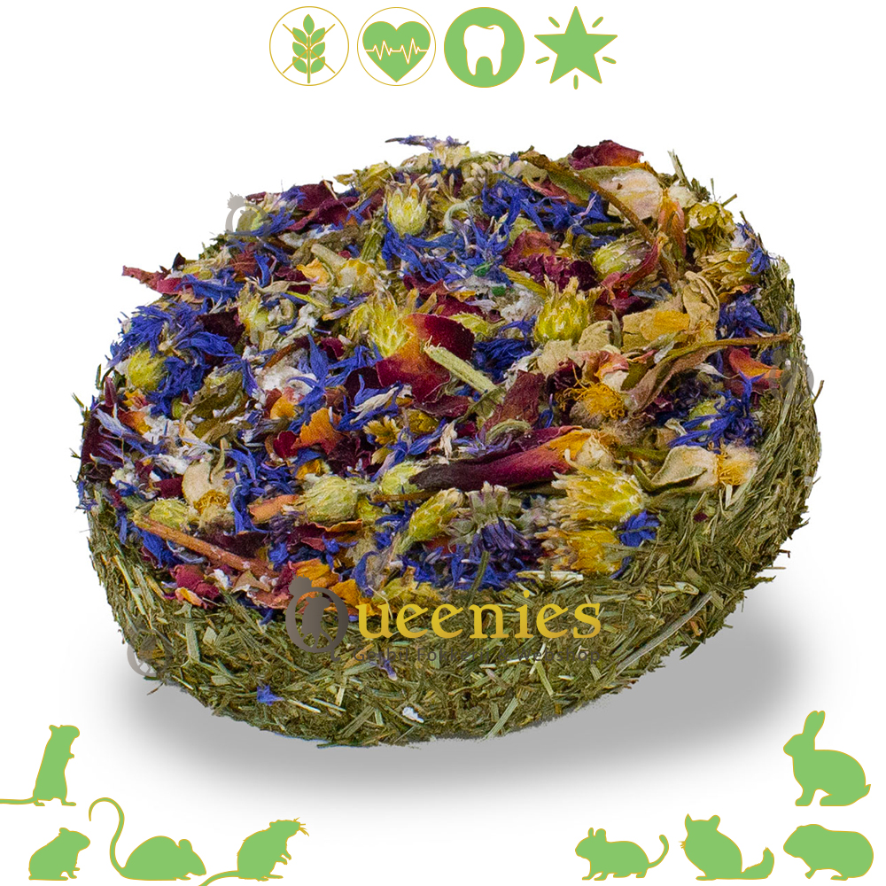 Deze Bloementaart van gedroogde Kruiden en grassen kan gezien worden als een gezond tussendoortje of een voedingssupplement voor Knaagdieren en Konijnen. U kunt deze voeren als tussendoortje, deze gezonde taart mag altijd aanwezig zijn in uw Knaagdieren Terrarium. Voedingssupplementen is aanvullend diervoeder, een kruidenpreparaat voor onze kleine Knagertjes of alle andere knaagdieren en dwergkonijnen.
