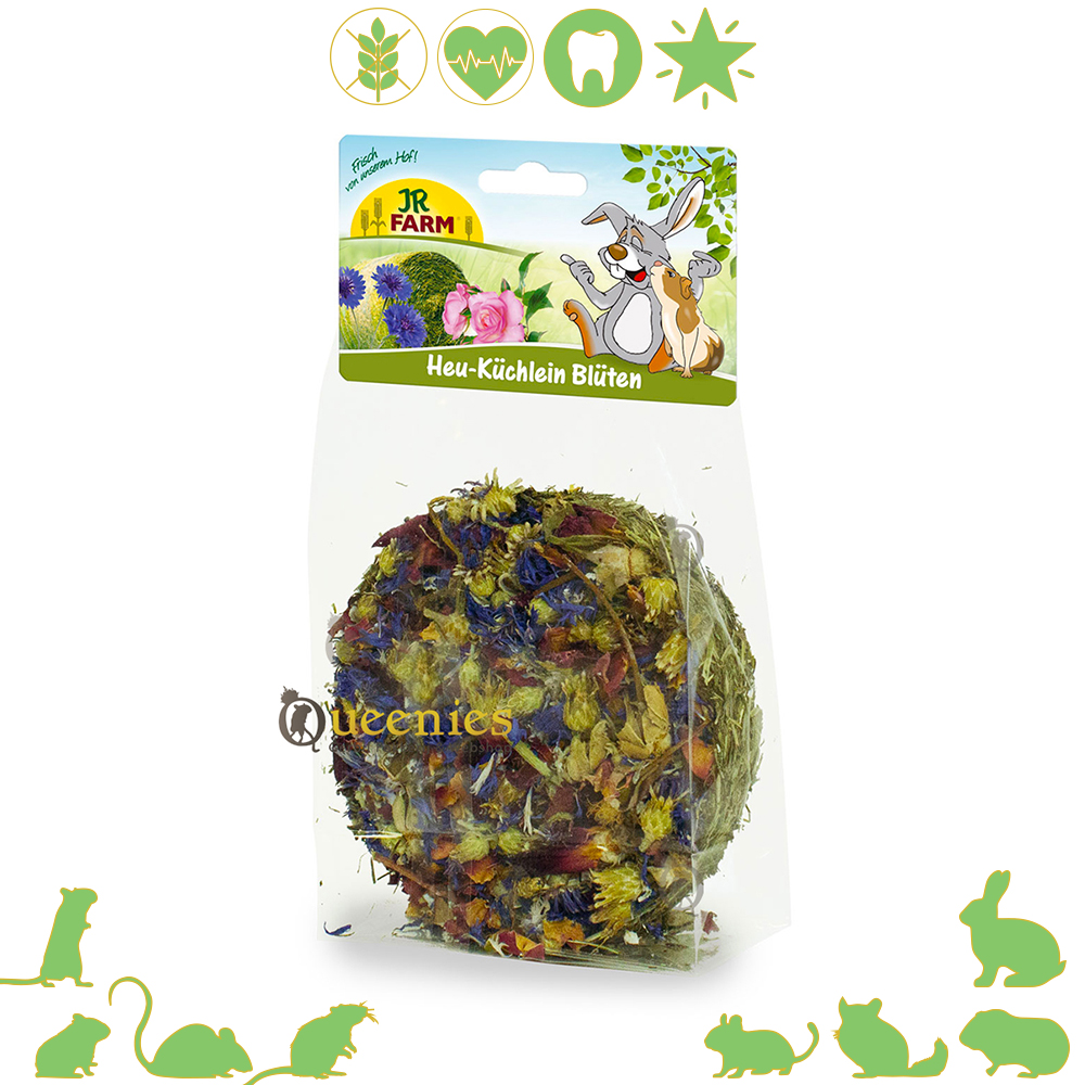 De taart is versierd met de aromatische korenbloem en roos. Gemaakt van 100% natuurlijk materiaal, de hooikoeken zijn volledig consumeerbaar. Korenbloem en roos dienen niet alleen als mooie topping, ze hebben een bloedzuiverend, diuretisch, ontstekingsremmend en verzachtend effect op de spijsverteringsorganen. Voorzichtig gedroogd bergweidehooi is de basis voor een gezonde voeding voor alle herbivore kleine dieren. Het hoge aandeel ruwe celstof bevordert ook de belangrijke tandafslijting bij knaagdieren en dwergkonijnen.