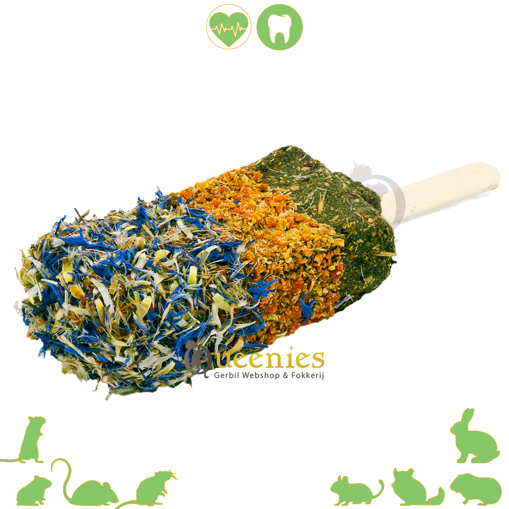 Dit Knapperige ijsje is een ware traktatie en pure verwennerij voor Gerbils, Hamsters, Muizen, Ratten, Cavia’s en Konijnen! Het zit vol met de meest smakelijke Dierenkruiden samengevoegd met gedroogde wortel groente, dat weer om een Knaaghoutje gevouwen zodat het op een ijsje lijkt. Qua kruiden zijn ook niet de minste kruiden gebruikt met de Korenbloemen. De onderste laag is een mengeling van bergweide hooi welke veel ruwe vezels bevatten.  Zo is dit Kruiden Ijsje van Jr Farm een voedzame en gezonde traktatie voor uw huisdier.