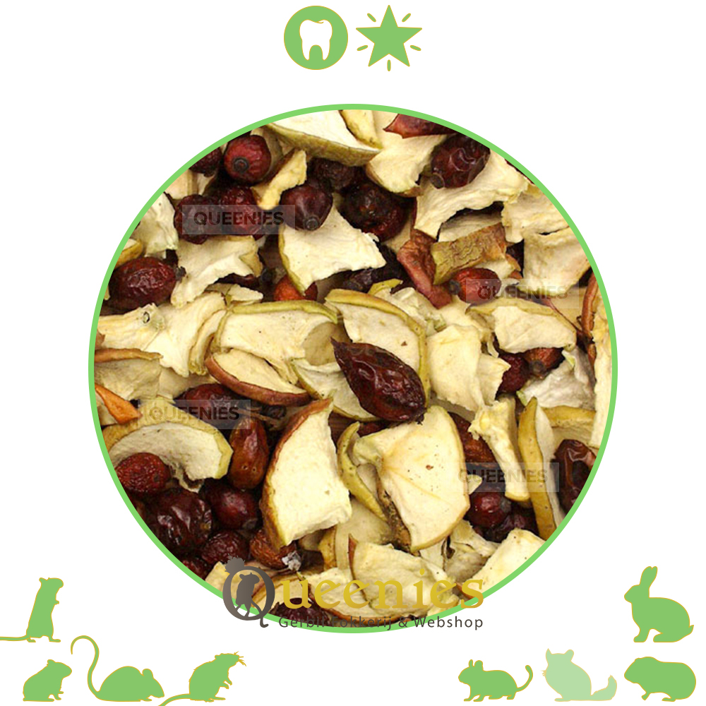 Inhoud: 125 gramSamenstelling: 70% Rozenbottel, 30% appelschijfjes gedroogdAnalyse: Eiwit 4,0%, vet 0,8% ruwe celstof 10,5%