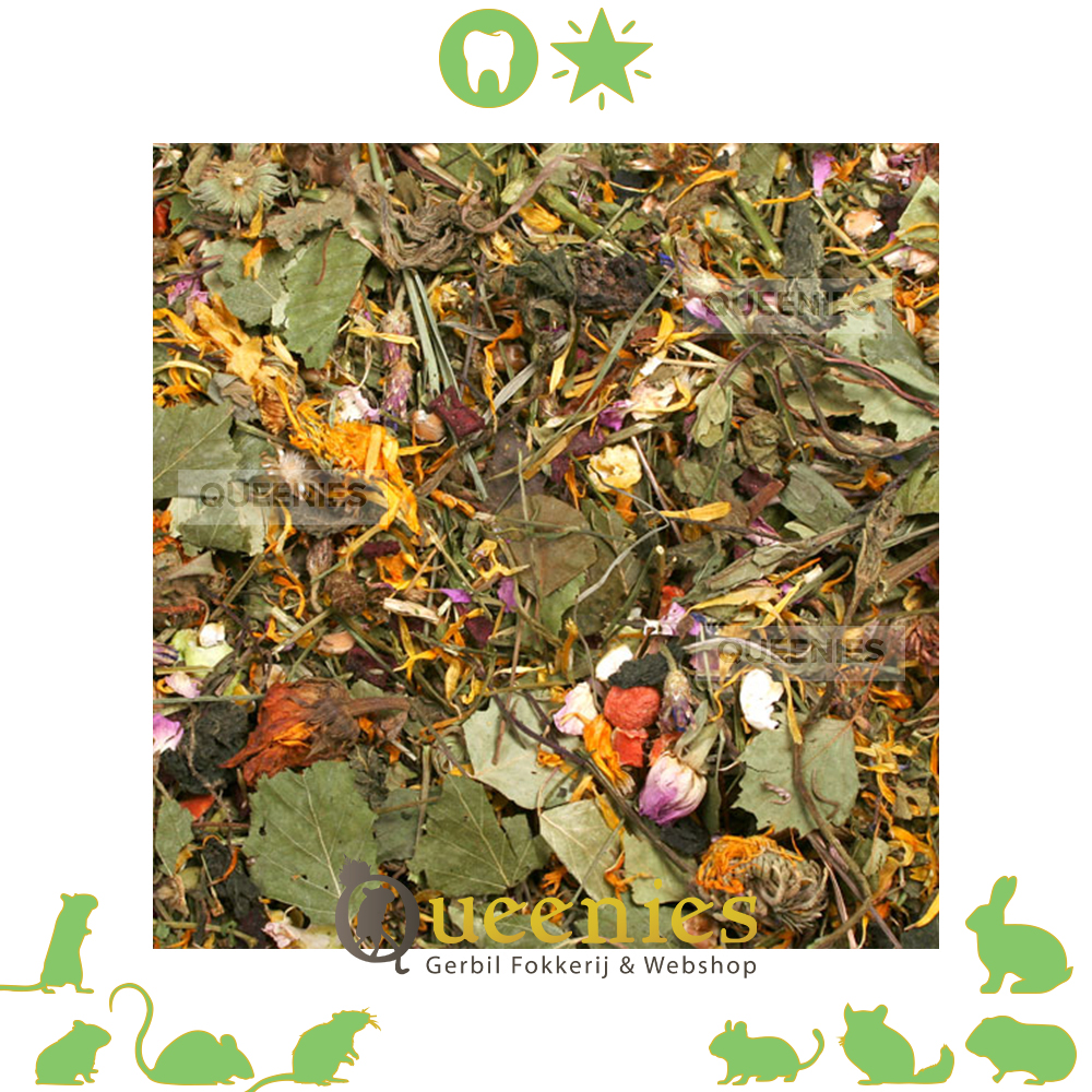Samenstelling: Goudsbloem, peterselie, haver, tarwe vlokken, bieten blokjes, erwten vlokken 7,2%, alfalfa, wortel blokjes, brandnetel bladeren, weegbree, tarwe, paardebloemen, gepofte tarwe, maïsvlokken, berkenblad, munt, rozenblaadjes 2%, hooi, maïs bloem 1,5% , kaasjeskruid, citroenmelisse, rode klaver 0,6%.