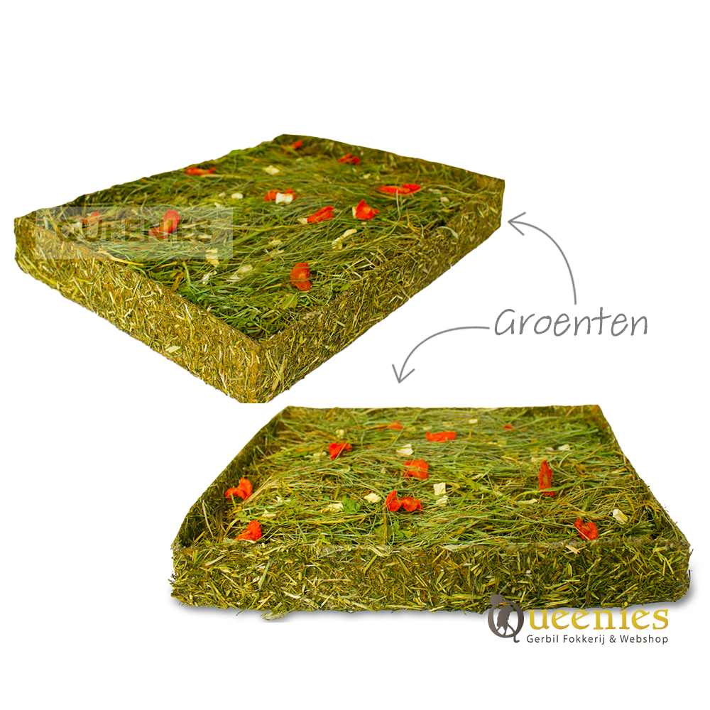 Dit Weiland met gedroogde Groente is veel meer dan alleen een stukje Bodembedekking; het is een waar stukje Weiland in het Knaagdier of Konijnenkooi. Hier kunnen onze geliefde Huisdieren naar hartenlust ontdekken, snuffelen en knabbelen, precies zoals ze dat in de natuur zouden doen. Dat noemen we Foerageren. Daarom is deze Kruidenweide met Groente ook een Foerageer mat. De geurige kruidenweide is verzachtend met Vitamine en Vezelrijk hooi die bestaat uit oa. gezonde Klaver, kleurrijke Kamille waardoor het een uniek stukje natuurlijke Weide is voor Dwerghamsters en Ratten.