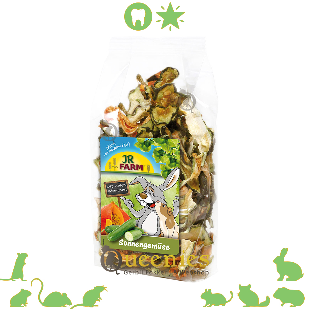De JR FARM is een heerlijke en gezonde snack voor Knaagdieren en Konijnen die weinig calorieën bevatten maar wel veel vitamines en mineralen! De Zonnegroente is een mix van gedroogde groenten die speciaal geselecteerd zijn op een hoog vezelgehalte ( energie ) geen vetten en geen dikmakende ingrienten. Een mix vol zongerijpte groenten die ieder Knaagdier of Konijn kan waarderen. De Mix bestaat uit verschilende gedroogde groenten zoals: Komkommer, courgette en pompoen. Deze groenten zijn een stevige knabbel, met veel natuurlijke vitaminen en mineralen voor tamme Gerbils en Knaagdieren