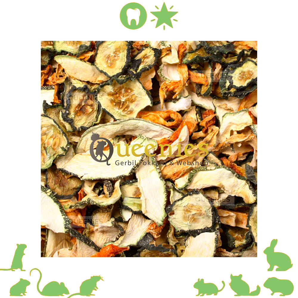 Voedingsstoffen: Gedroogde groenten behouden veel van hun voedingsstoffen zoals vitamines, mineralen en vezels. Dit heeft een aanvulling zijn op het dieet van Knaagdieren en Konijnen die van nature veel vezels en plantaardig voedsel nodig hebben.