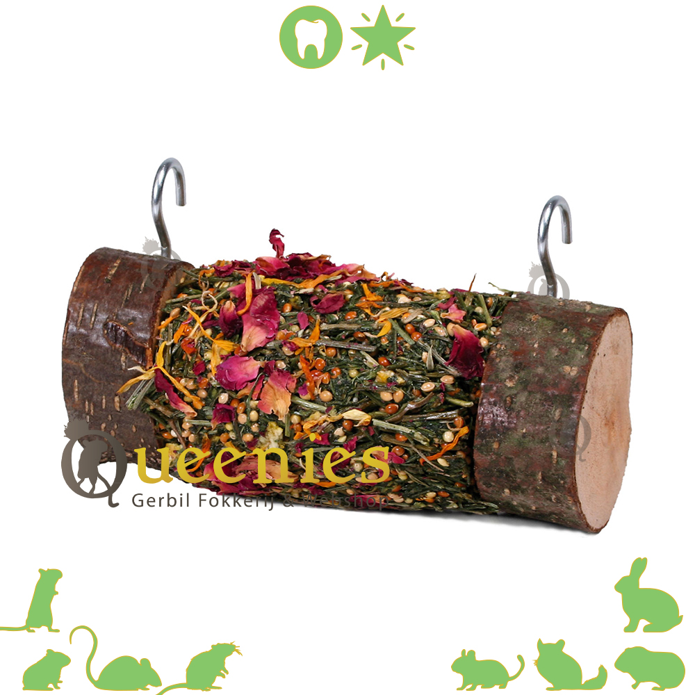 Er zitten meerdere kruiden en bloemen in die een hele postitieve werking hebben op de gezondheid van uw Gerbil of Knaagdier. De Woodfield Roll 'n' Fun bevat meerdere eurige Goudsbloem en Rozenbloesems. Gemengd met peterselie en verschillende soorten gierst wat Gerbils en Knaagdieren uitnodigen om de tandjes in deze verrukkelijke knabbelrol te zetten. De geuren die vrijkmoen als deze rol is opgehangne zal de aandacht van uw huisdier direct trekken. Doordat de rol zeer krokant en hard gebakken is bevordert dit de natuurlijke tand en nagel slijtage.