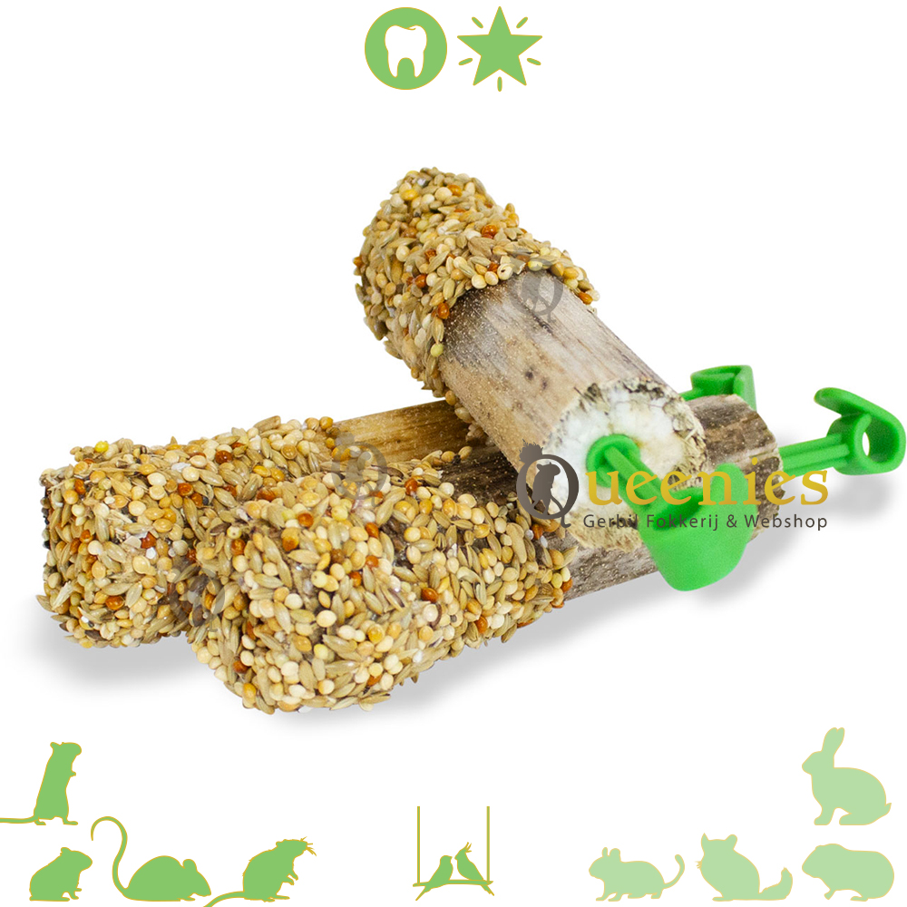 De onbehandelde gierst zonnebloemstelen kunnen overal in de kooi/volière geplaatst worden en zijn volledig consumeerbaar (behalve de hangers).
