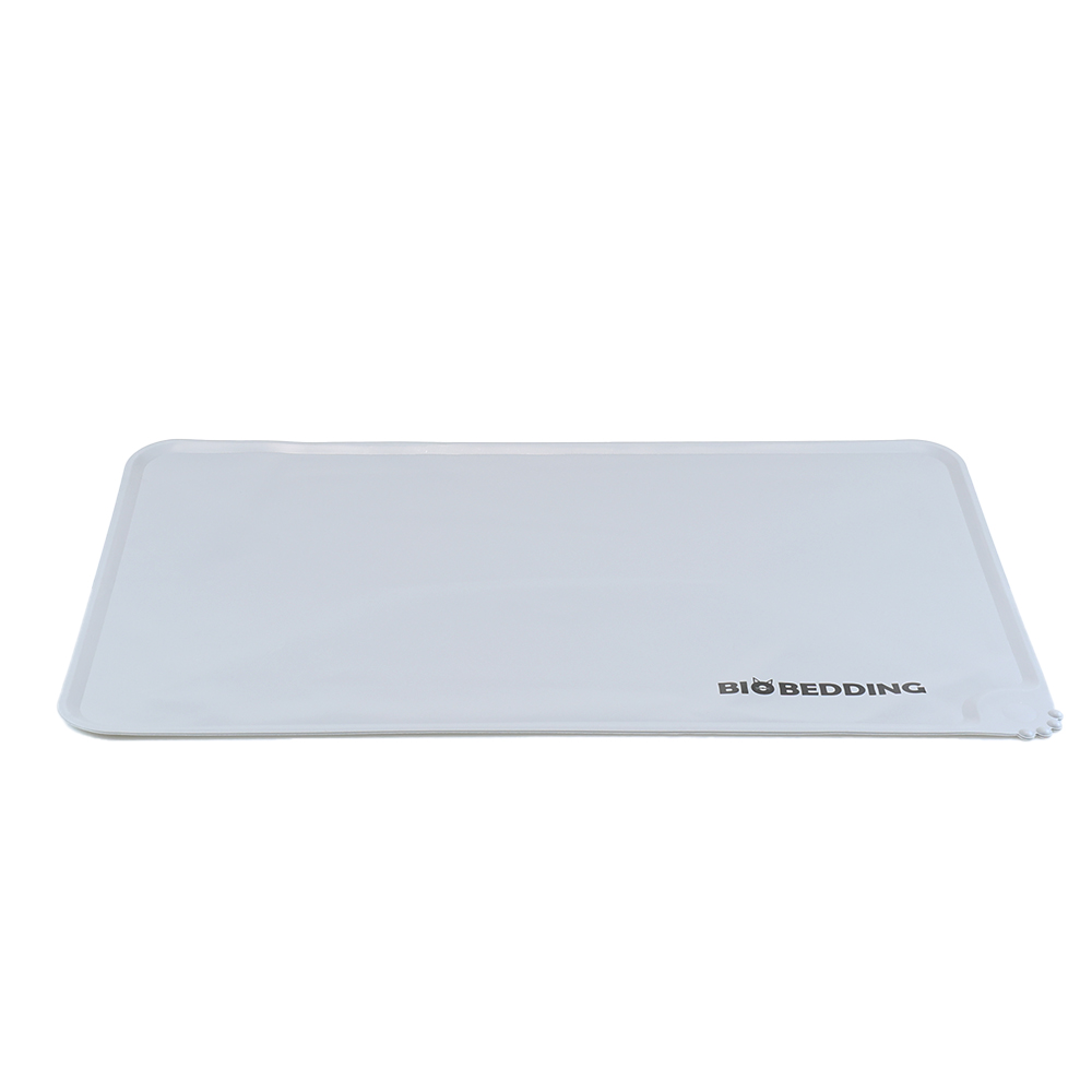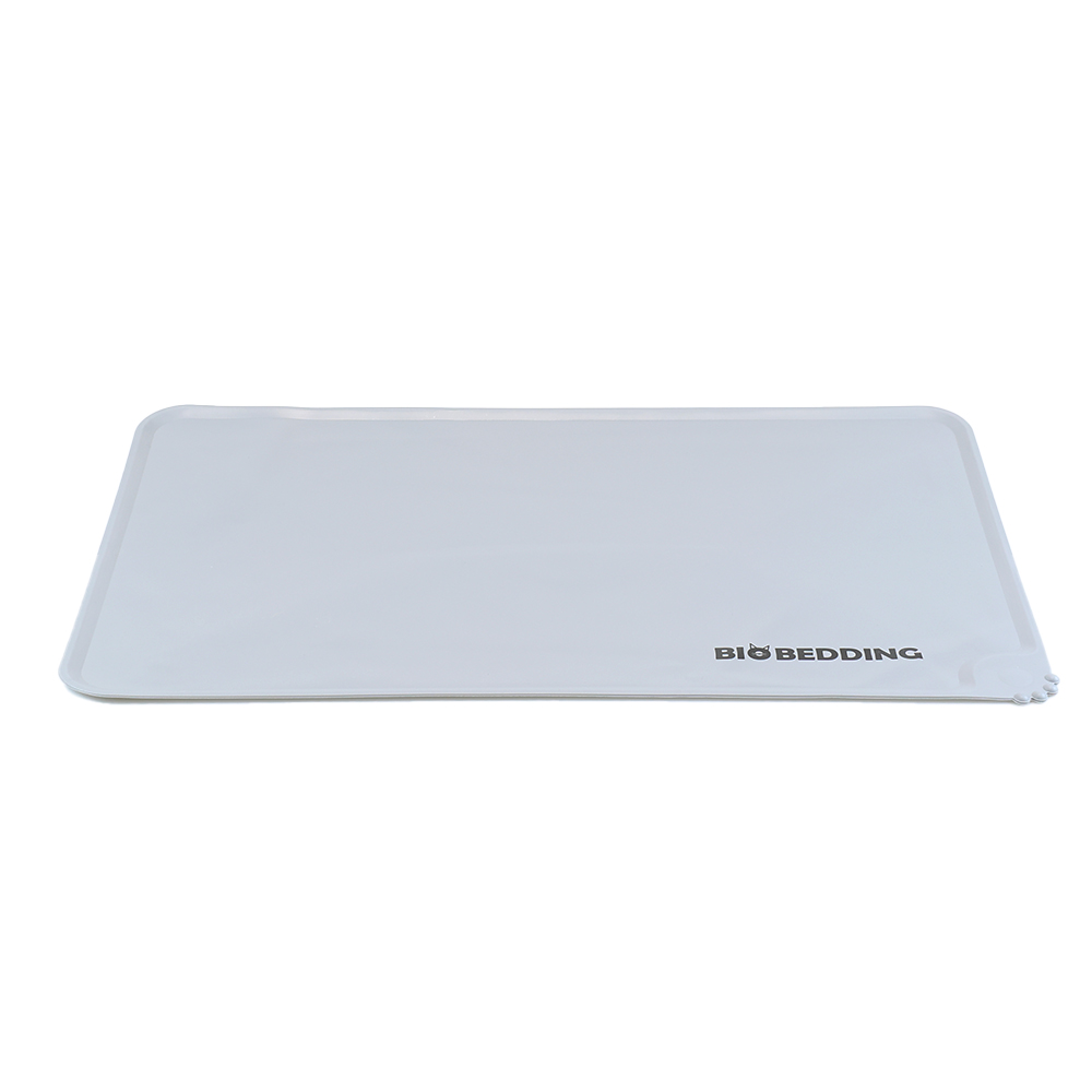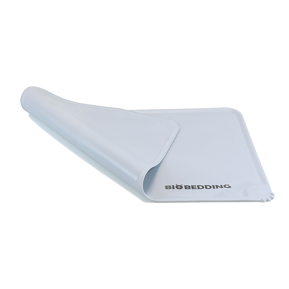 Afmetingen: 48 x 30 cm Materiaal: Siliconen Kleur: Lichtgrijs Geschikt voor: Onderlegmat voor voer en waterbakken of drinkfonteinen