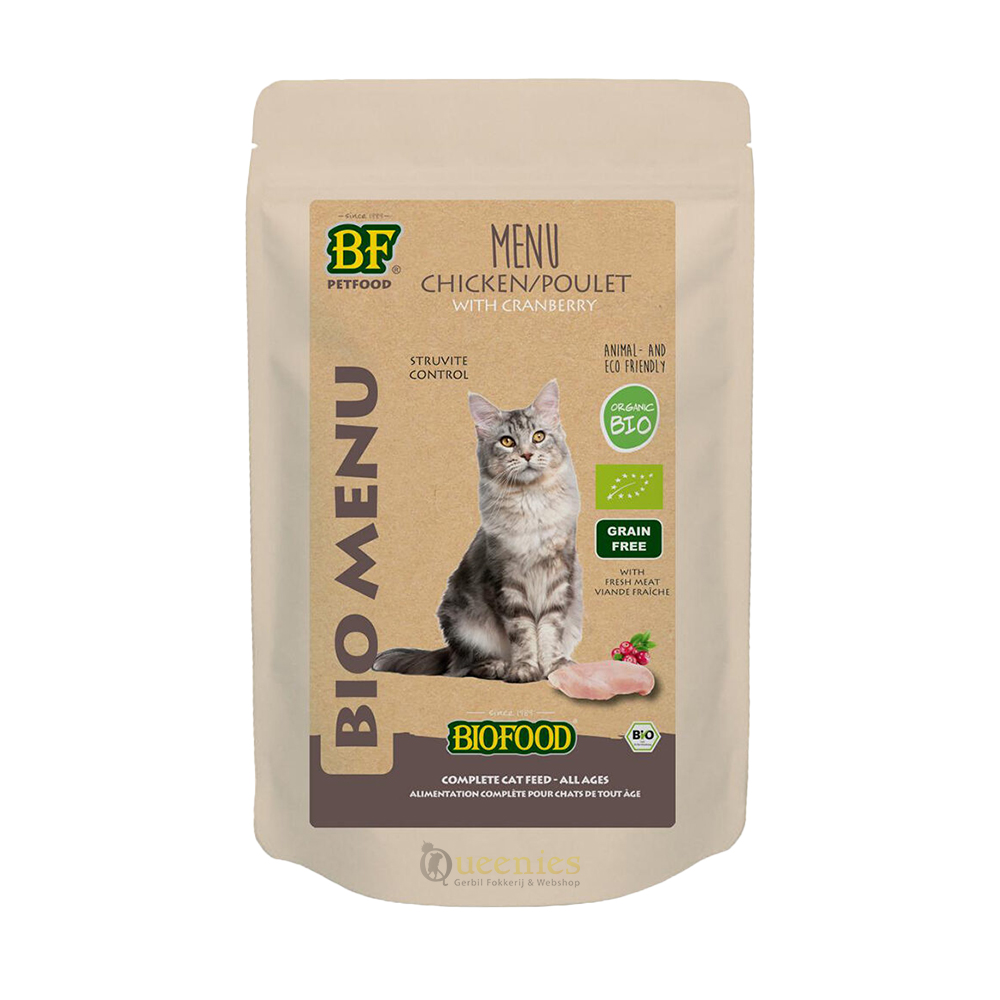 BF Petfood Bio Kip Menu is een smaakvolle, biologische maaltijd die perfect past bij de dagelijkse voedingsbehoefte van katten van alle leeftijden. Deze complete natvoeding bevat 79% vers kippenvlees van biologische oorsprong en is verrijkt met zorgvuldig geselecteerde groenten en fruit, zoals wortel en cranberry. Dankzij het gebruik van één dierlijke eiwitbron is het ideaal voor katten met allergieën of een gevoelige spijsvertering.
