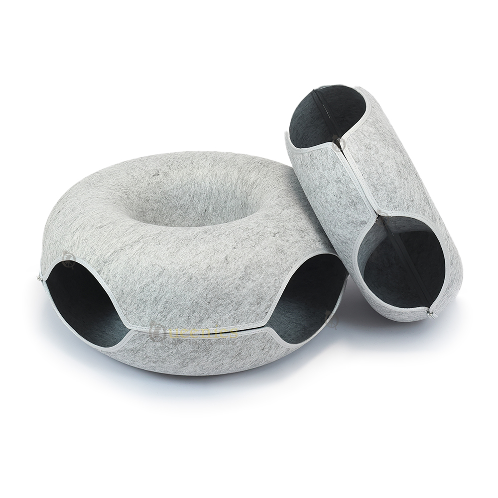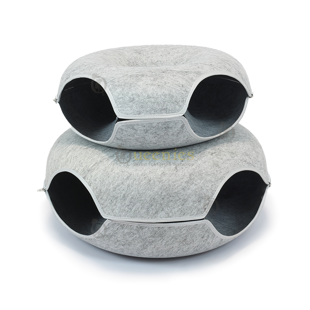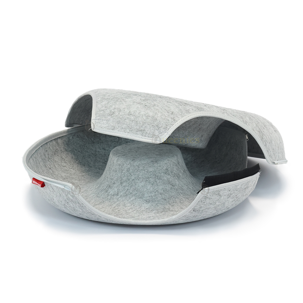 De stevige vilten wanden dempen geluiden en geven katten een gevoel van bescherming. Dankzij de dubbele ingangen hebben ze altijd een uitweg, wat stress vermindert en zelfvertrouwen geeft.